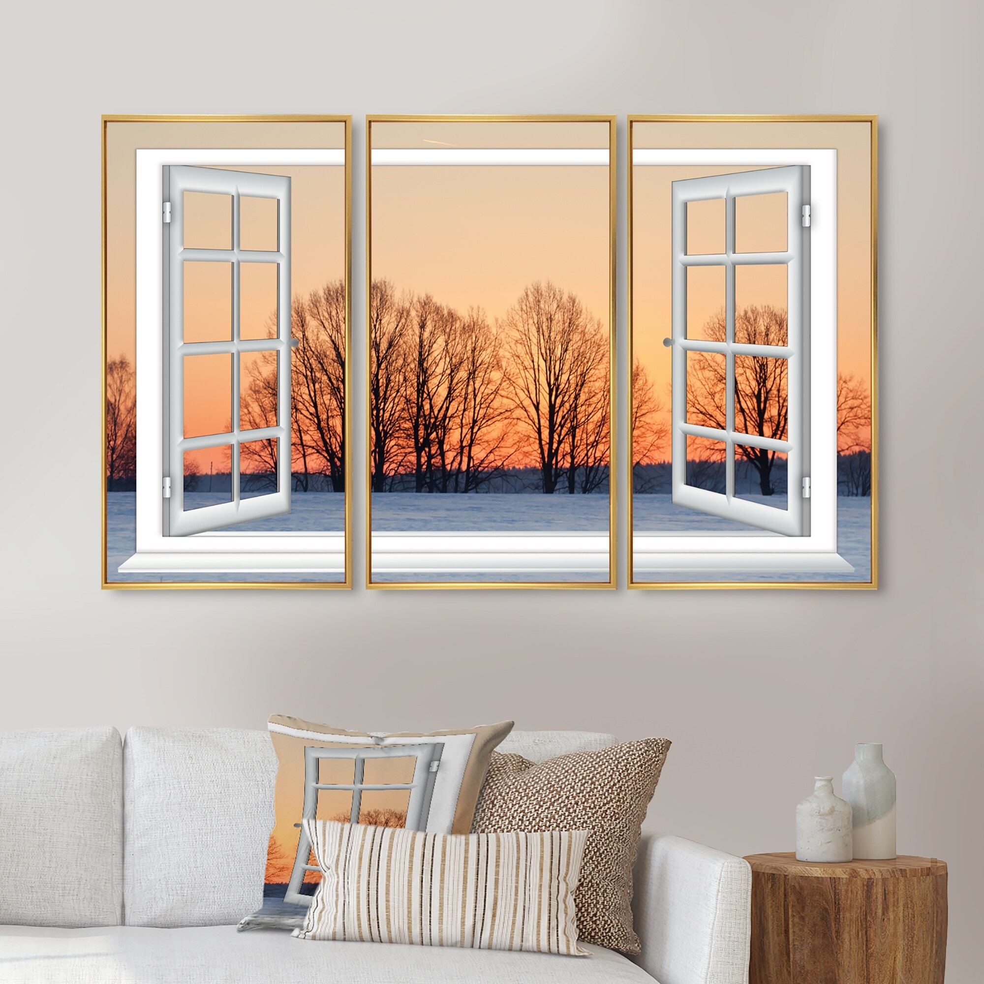 Designart "Open Window to Snowy Sunset" Landscape Framed Artwork Set of 3 - 4 Colors of Frames