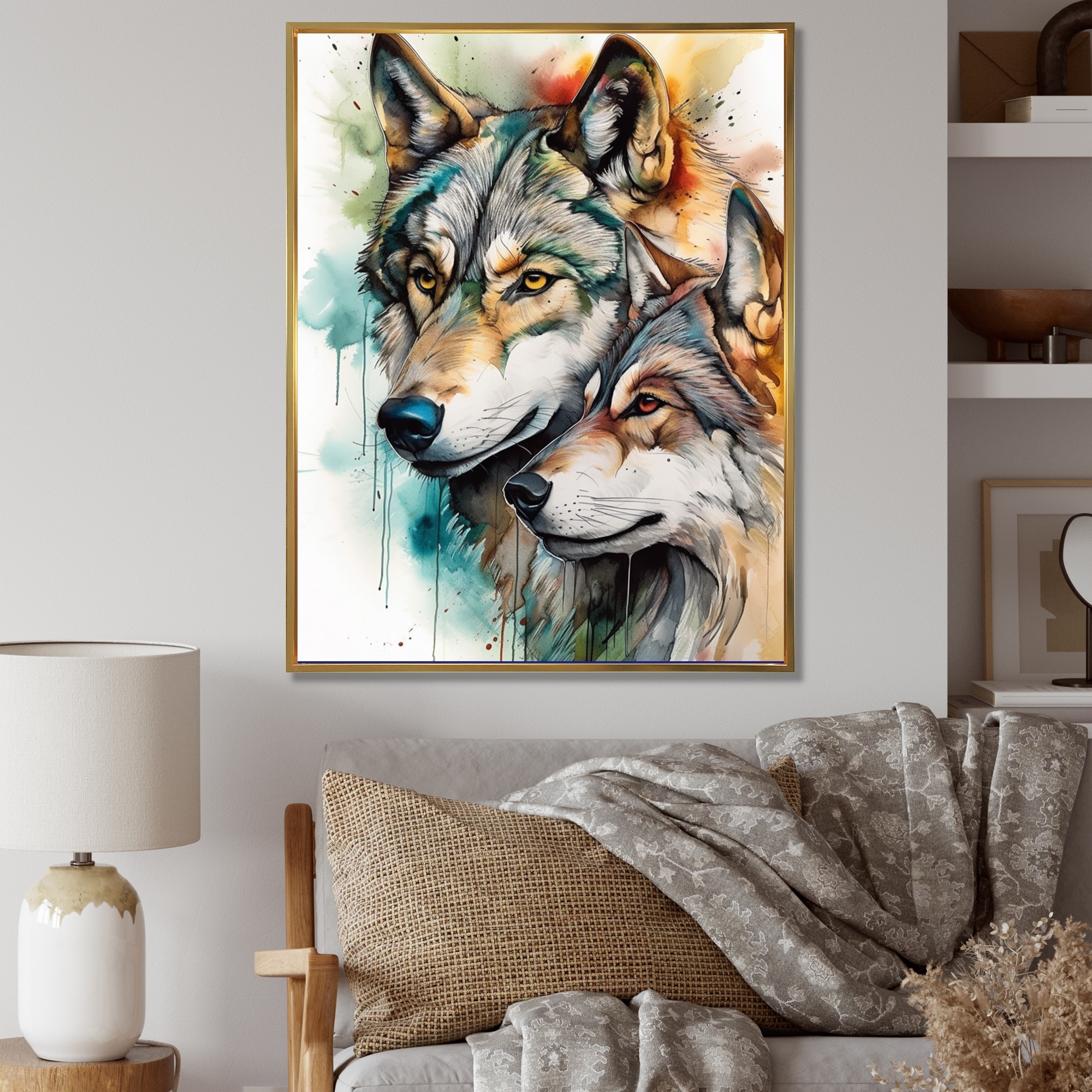 Designart "Wolves Portrait Watercolor1" Animals Wolf Framed Canvas Wall Art