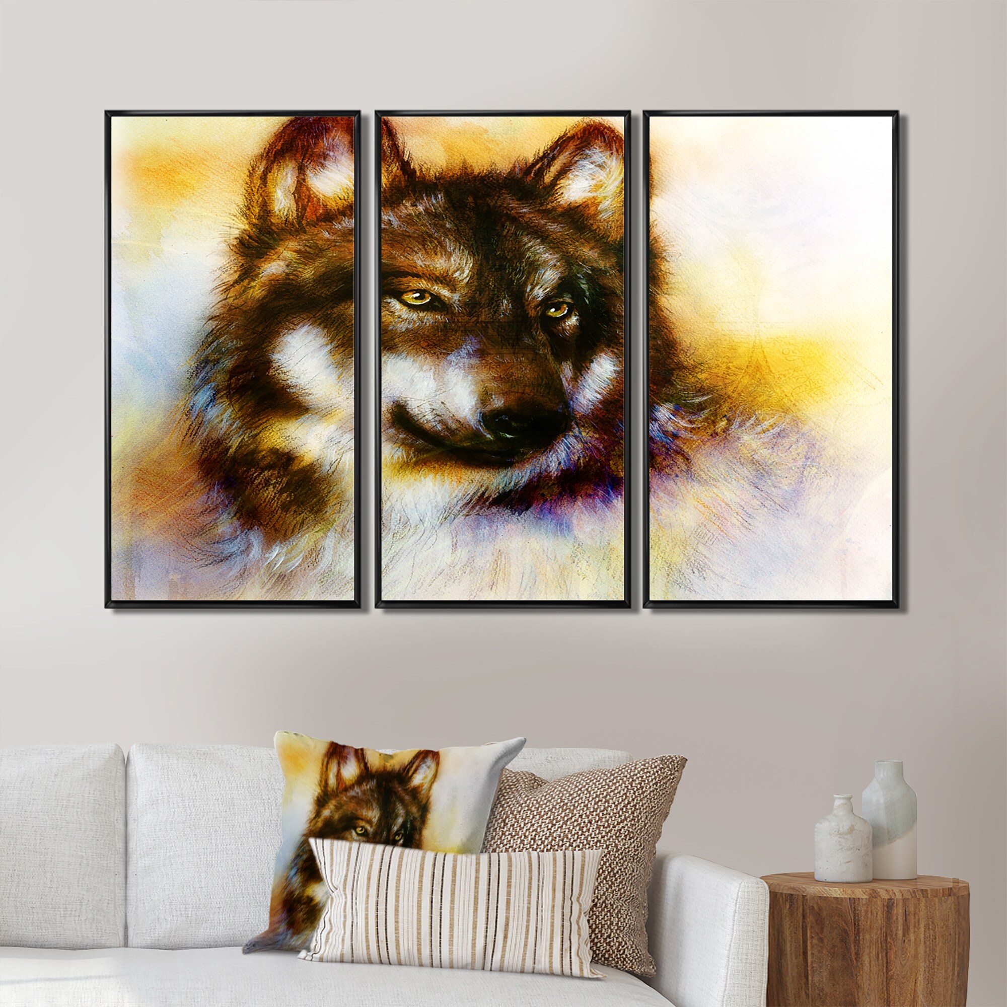 Designart "Brown Wolf" Animal Framed Wall Decor Set of 3 - 4 Colors of Frames