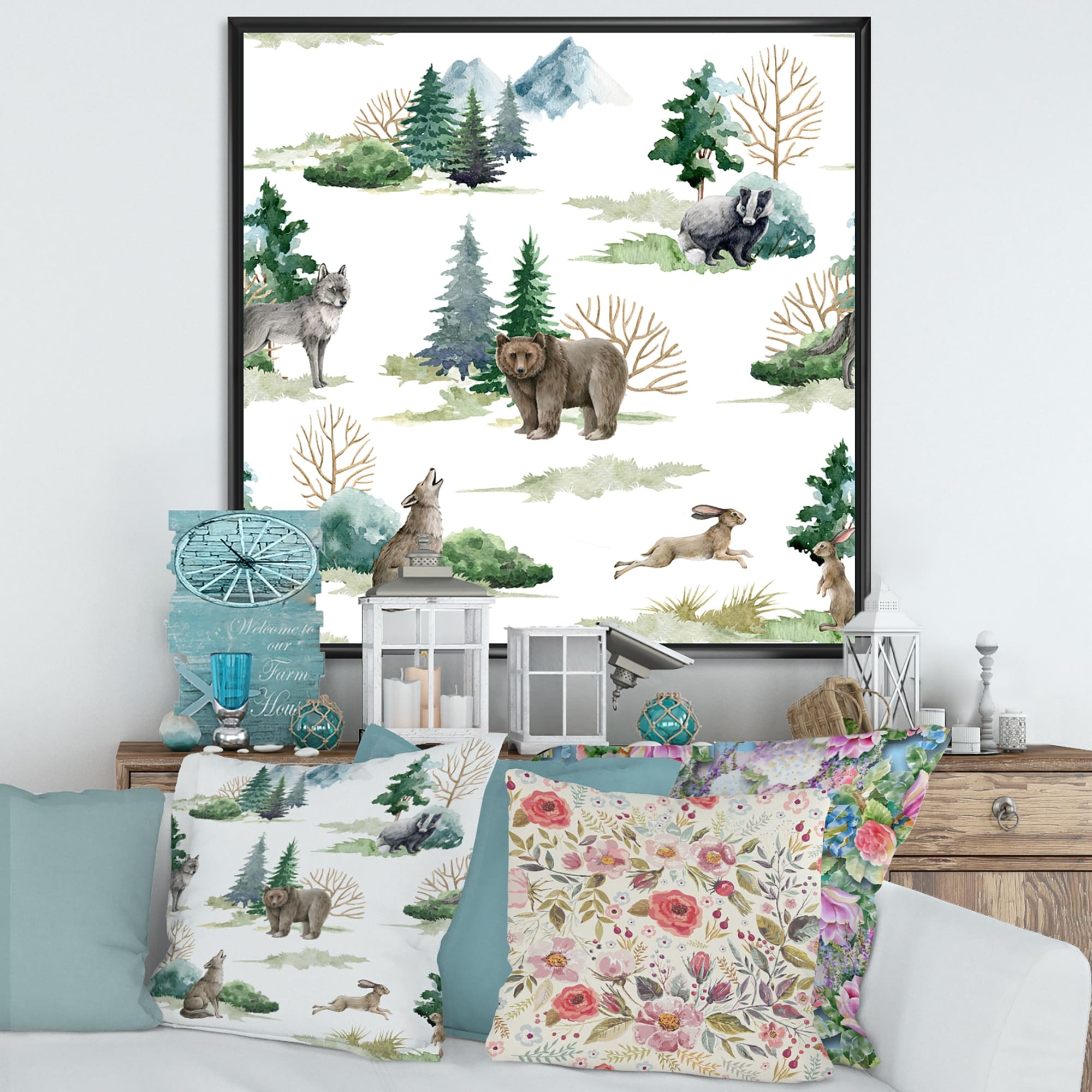 Designart "Forest Bear Wolf Rabbit Badger And Fir Trees" Patterned Framed Canvas Wall Art Print