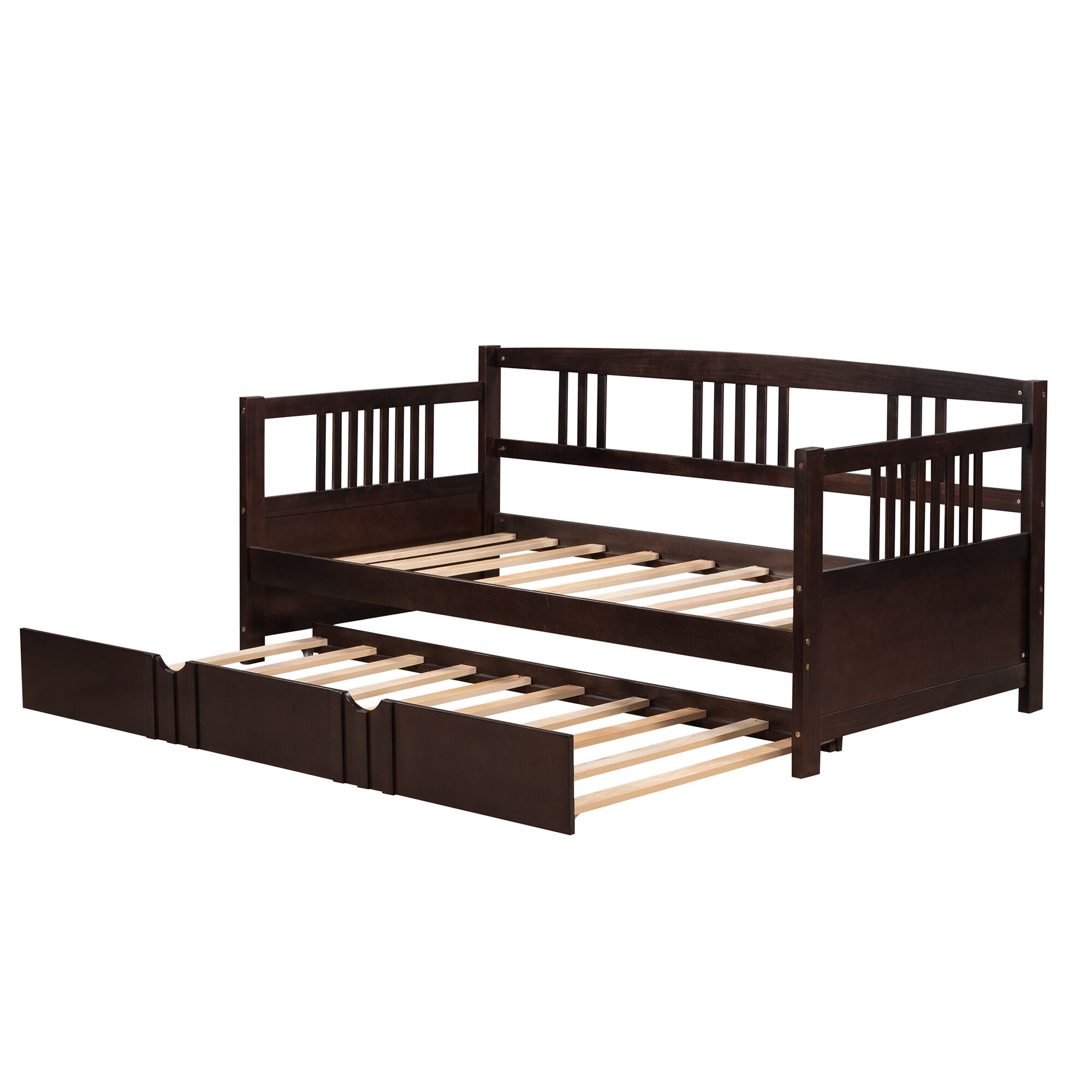 Twin Size Daybed Wood Bed Modern Pull-out Bed with Twin Size Trundle, Sturdy Slatted Frame & Guardrail Backrest Easy to Assemble