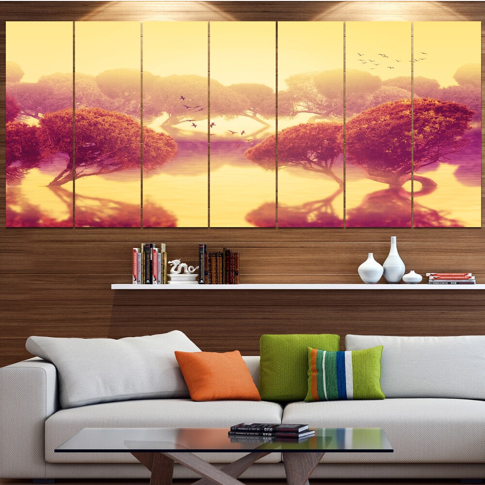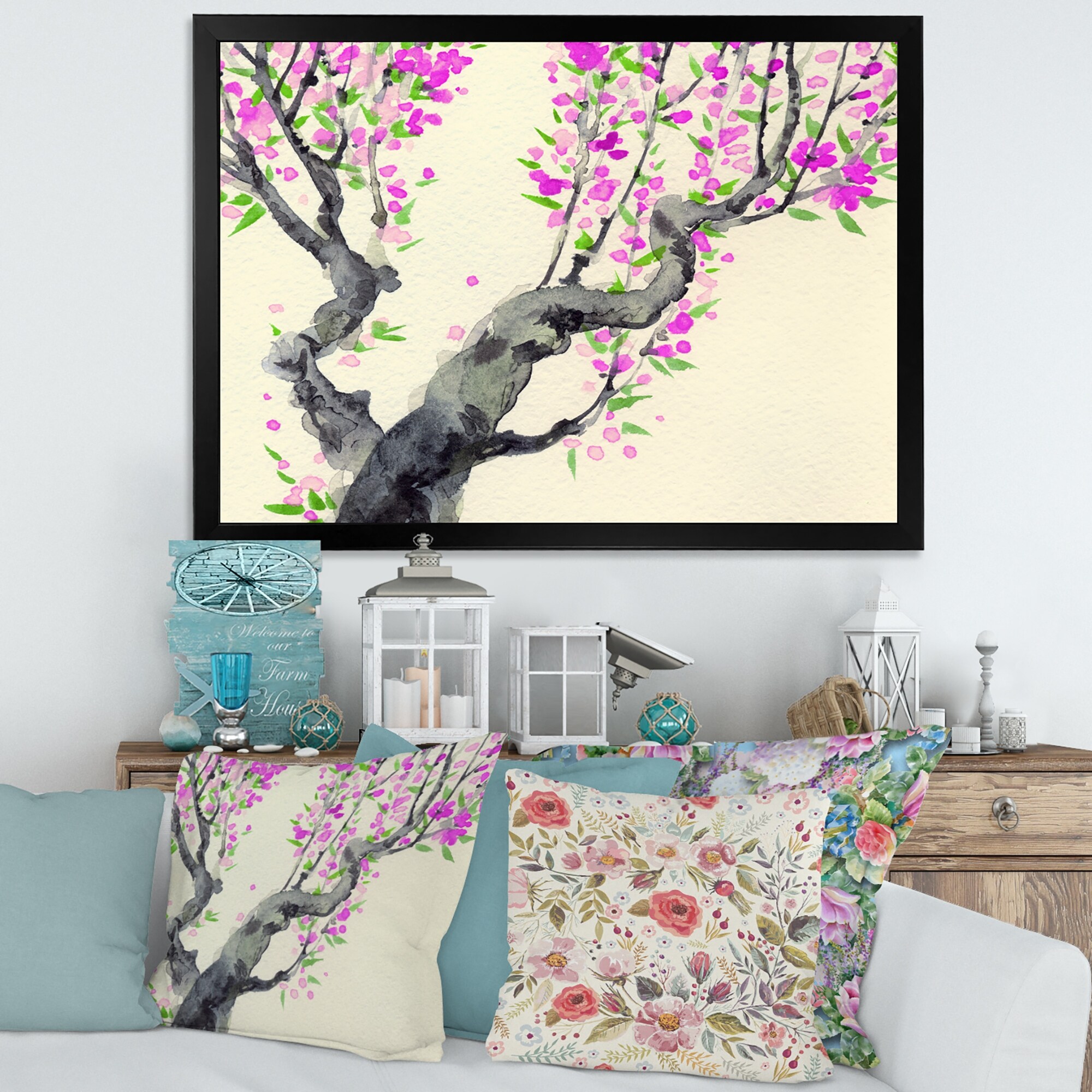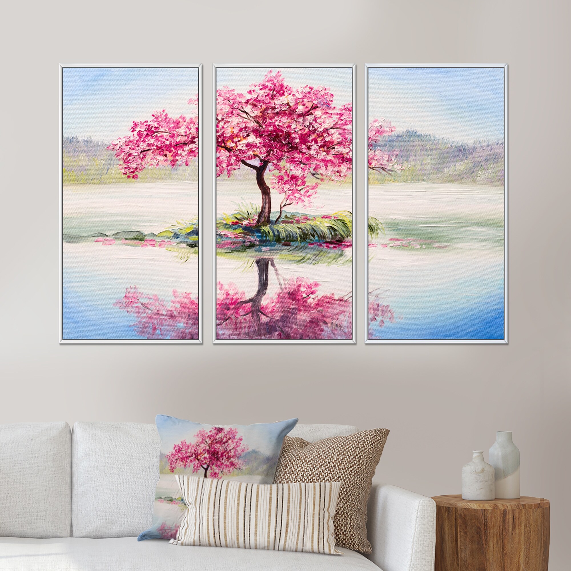 Designart "Japanese Cherry Blossom Tree on Little Idyllic IsLand" Farmhouse Framed Artwork Set of 3 - 4 Colors of Frames