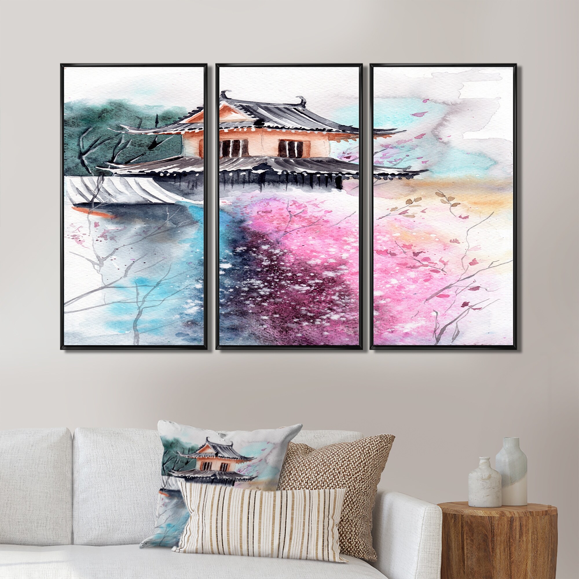 Designart "Cherry Blossoms With Japanese Temple" Vintage Framed Art Set of 3 - 4 Colors of Frames