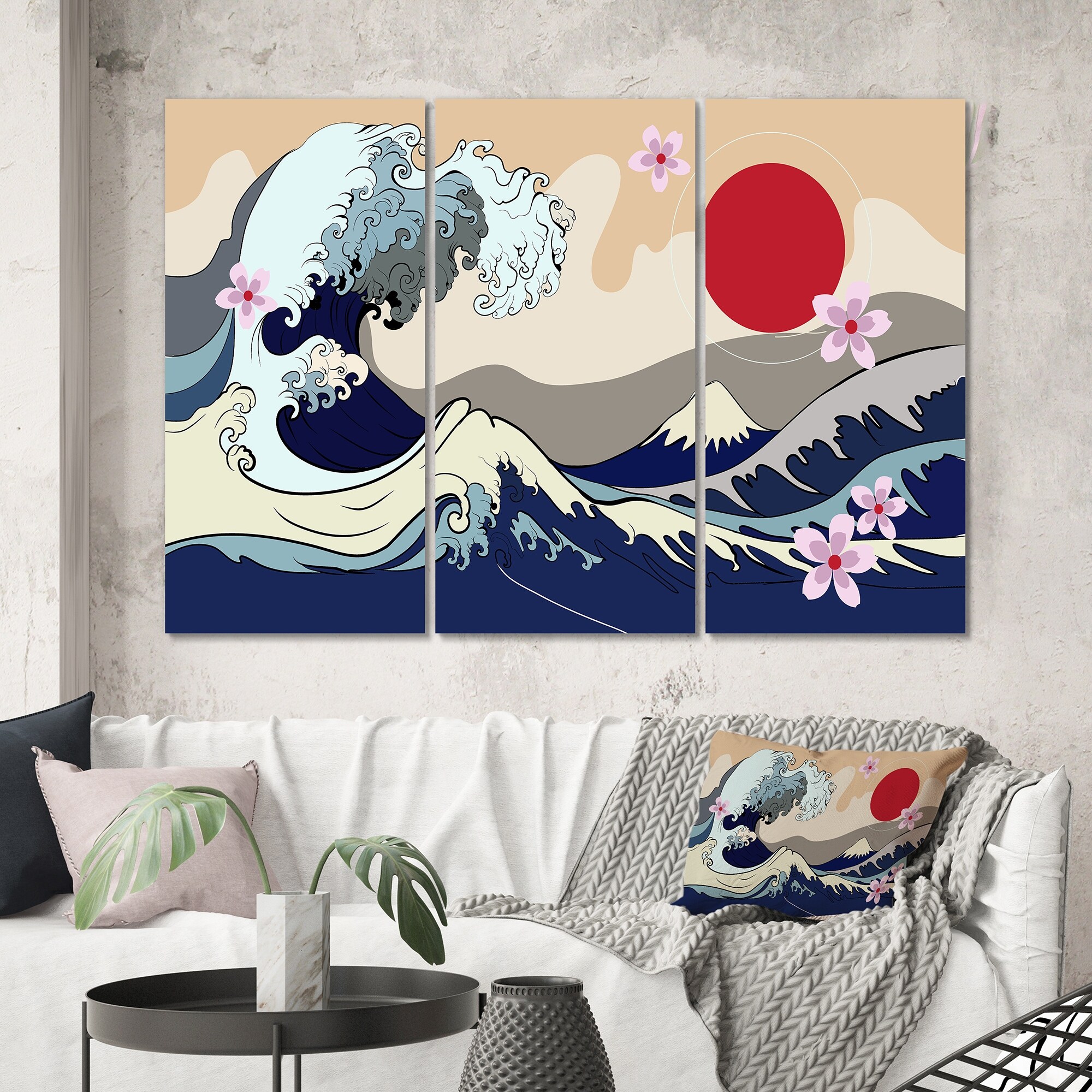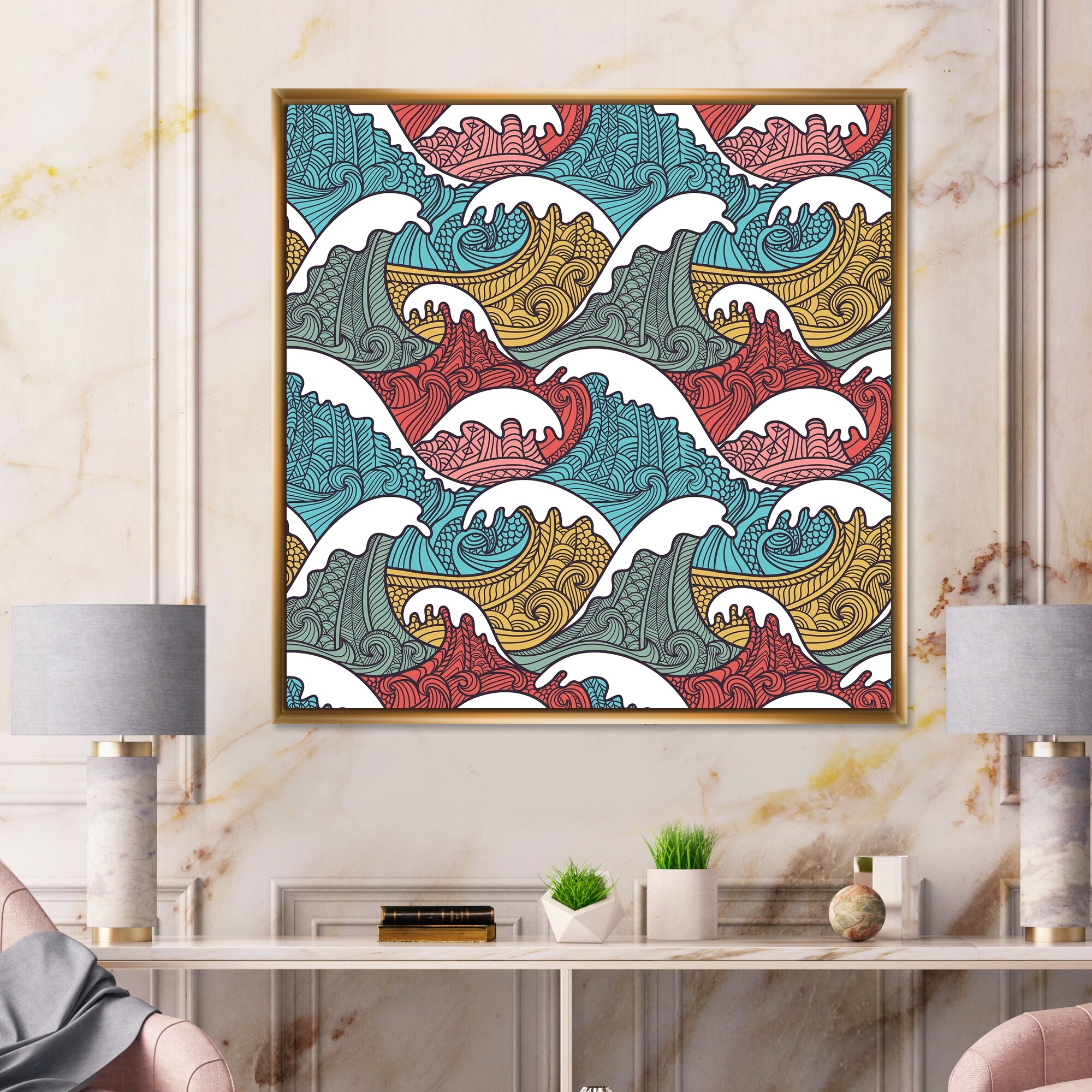 Designart "Red Blue And Grey Japanese Waves" Nautical & Coastal Framed Canvas Wall Art Print