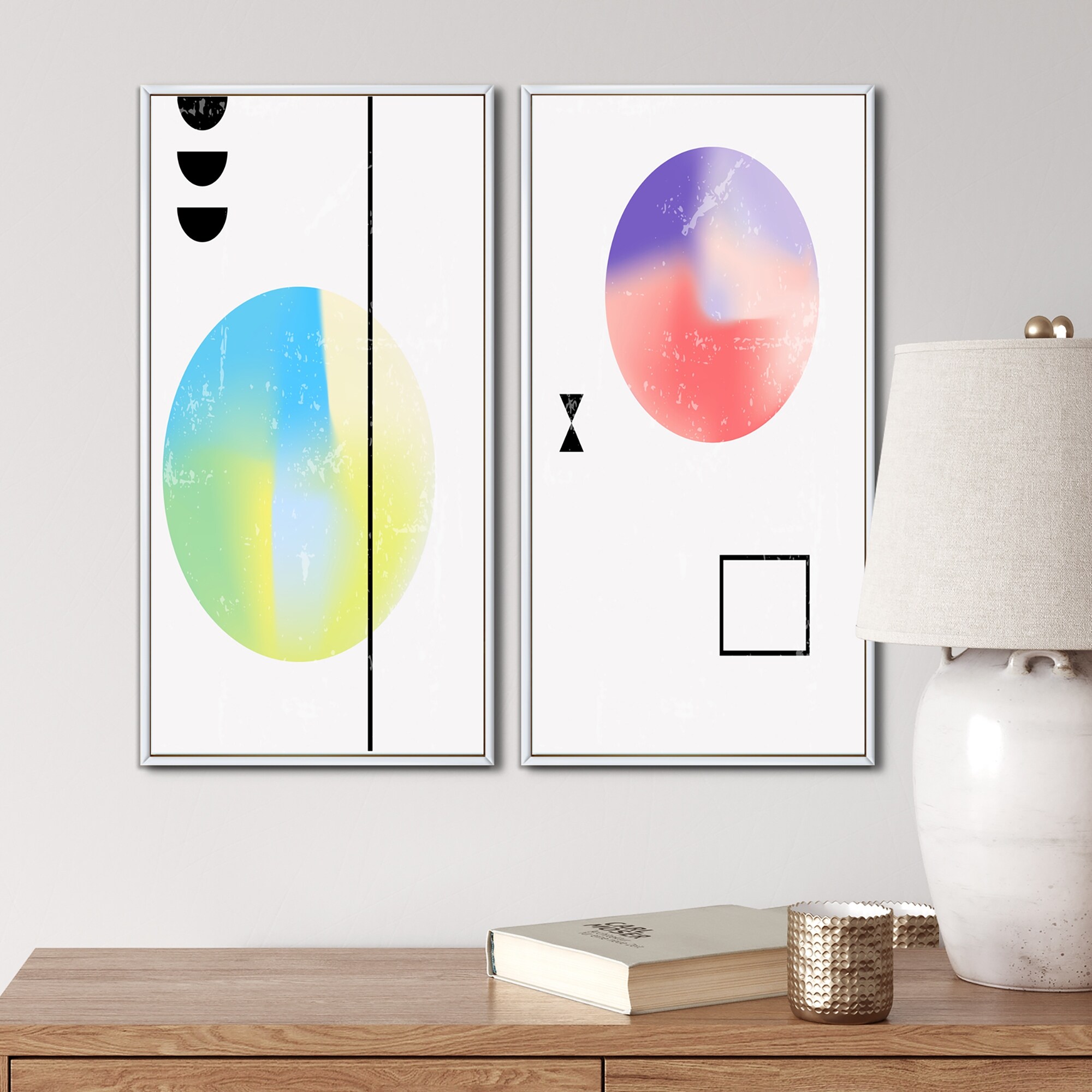 Designart "Japanese Abstract Universe in Retro Colors I" Geometric Framed Art Set of 2 Pieces