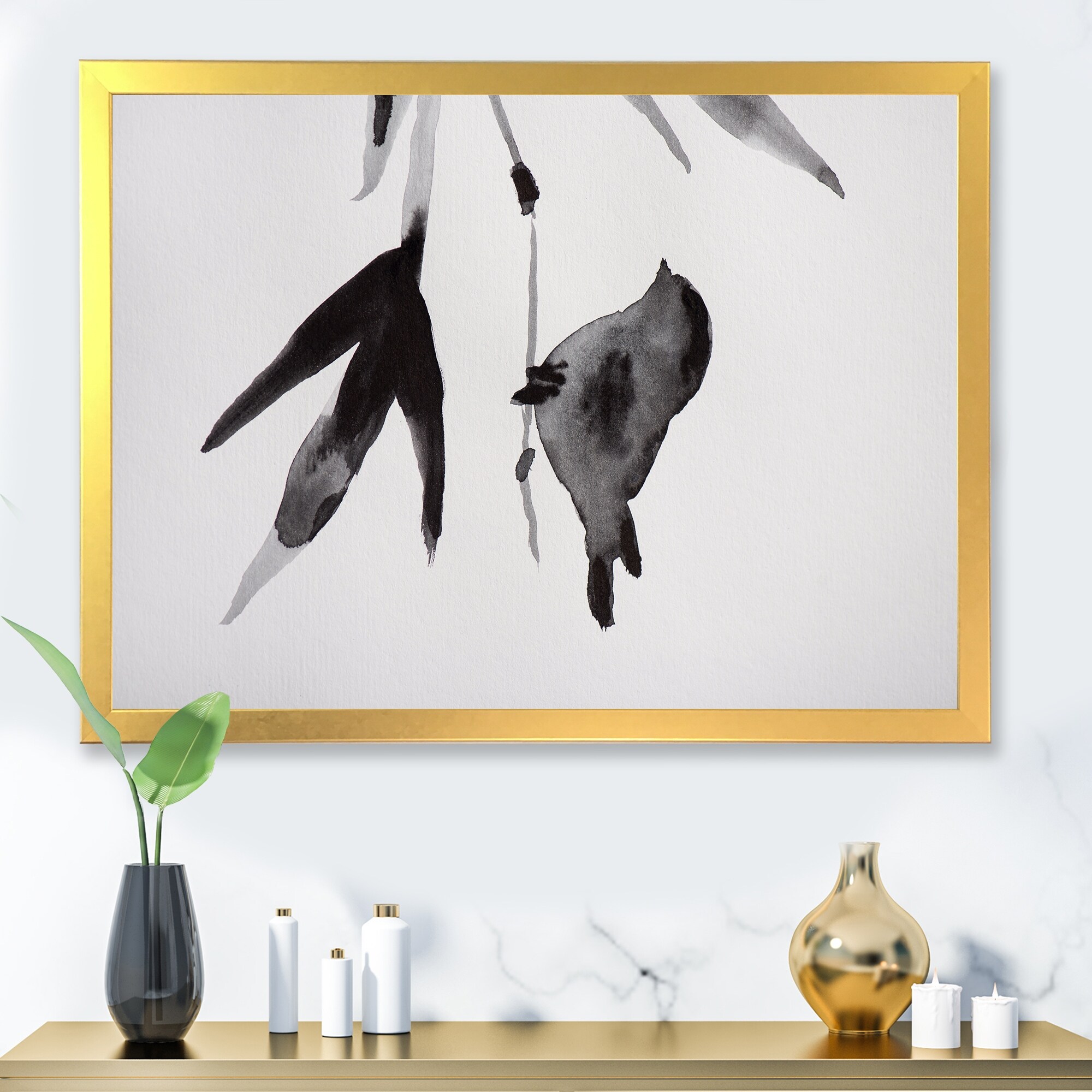 Designart "Vintage Japanese Bird on Branch" Traditional Framed Canvas Wall Art Print