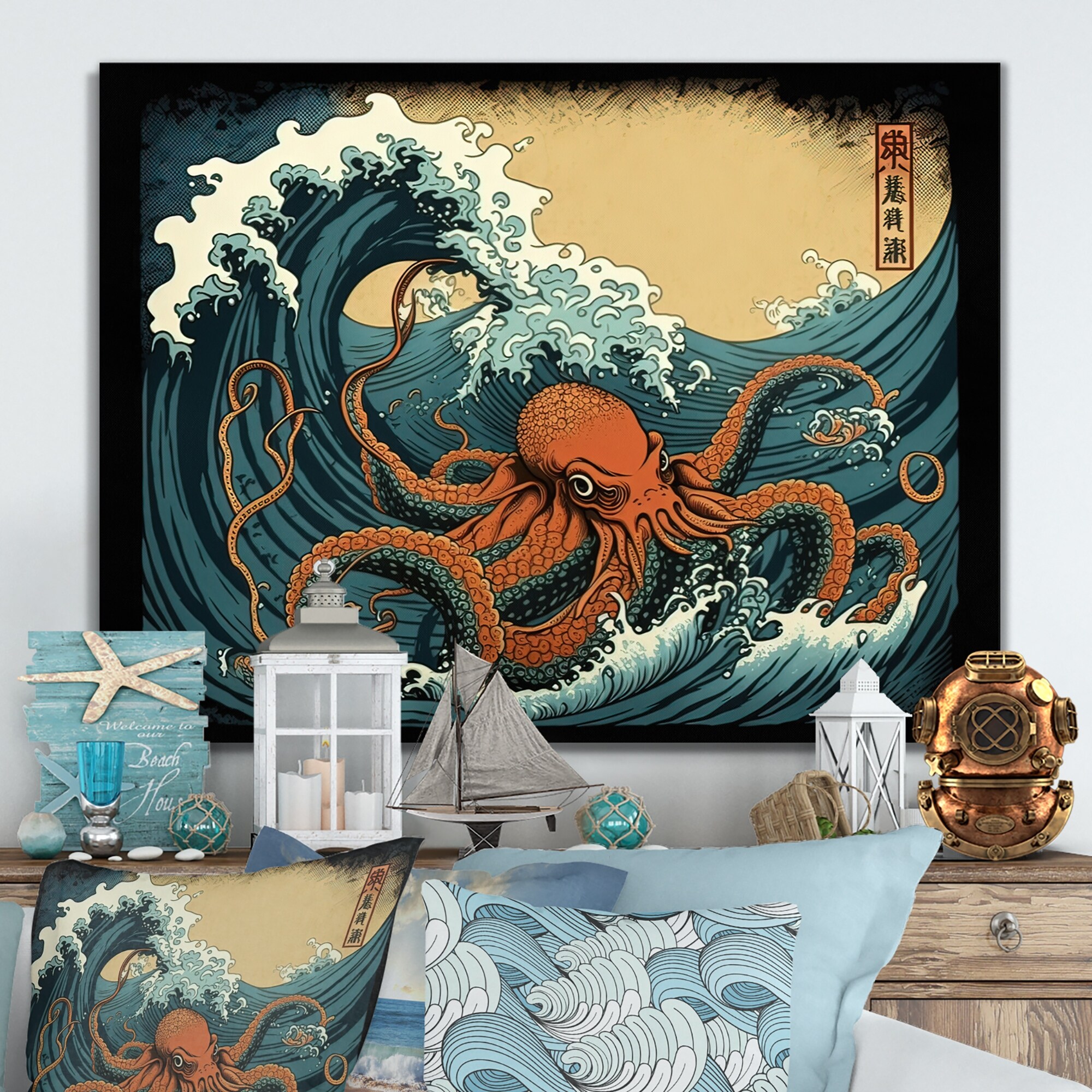 Designart "Japanese Landscape With Octopus III" Japanese / Country Canvas Wall Art