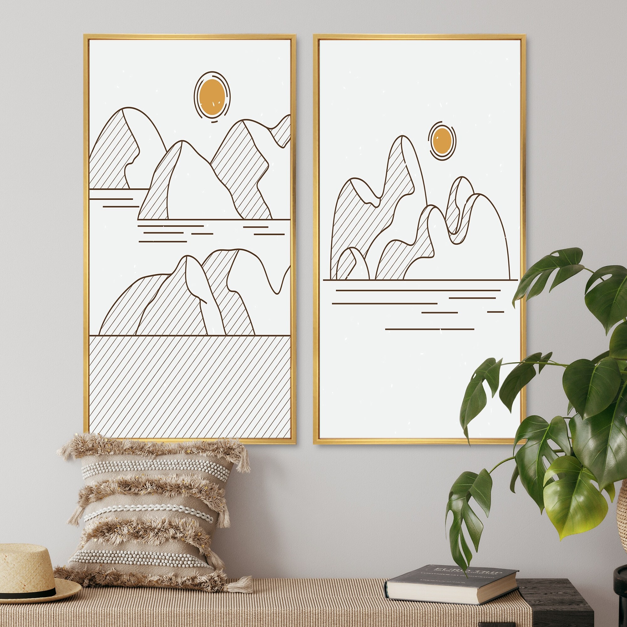 Designart "Japanese Line Art Landscapes I" Landscapes Framed Art Set of 2 Pieces