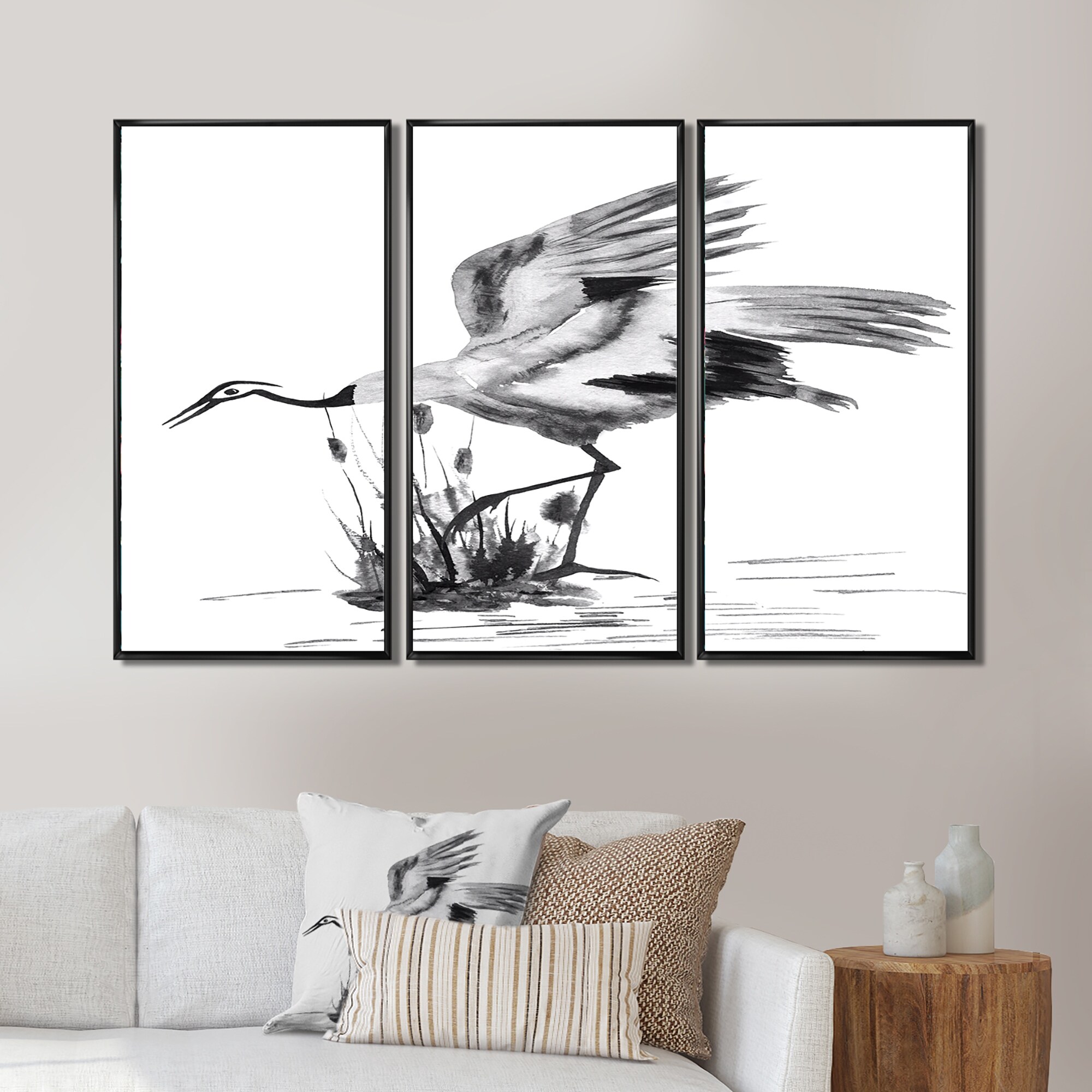 Designart "Japanese Crane Bird" Traditional Framed Art Prints Set of 3 - 4 Colors of Frames