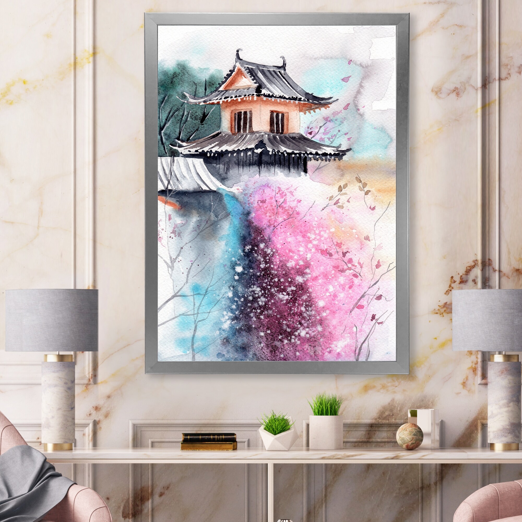 Designart "Cherry Blossoms With Japanese Temple" Vintage Framed Art Print
