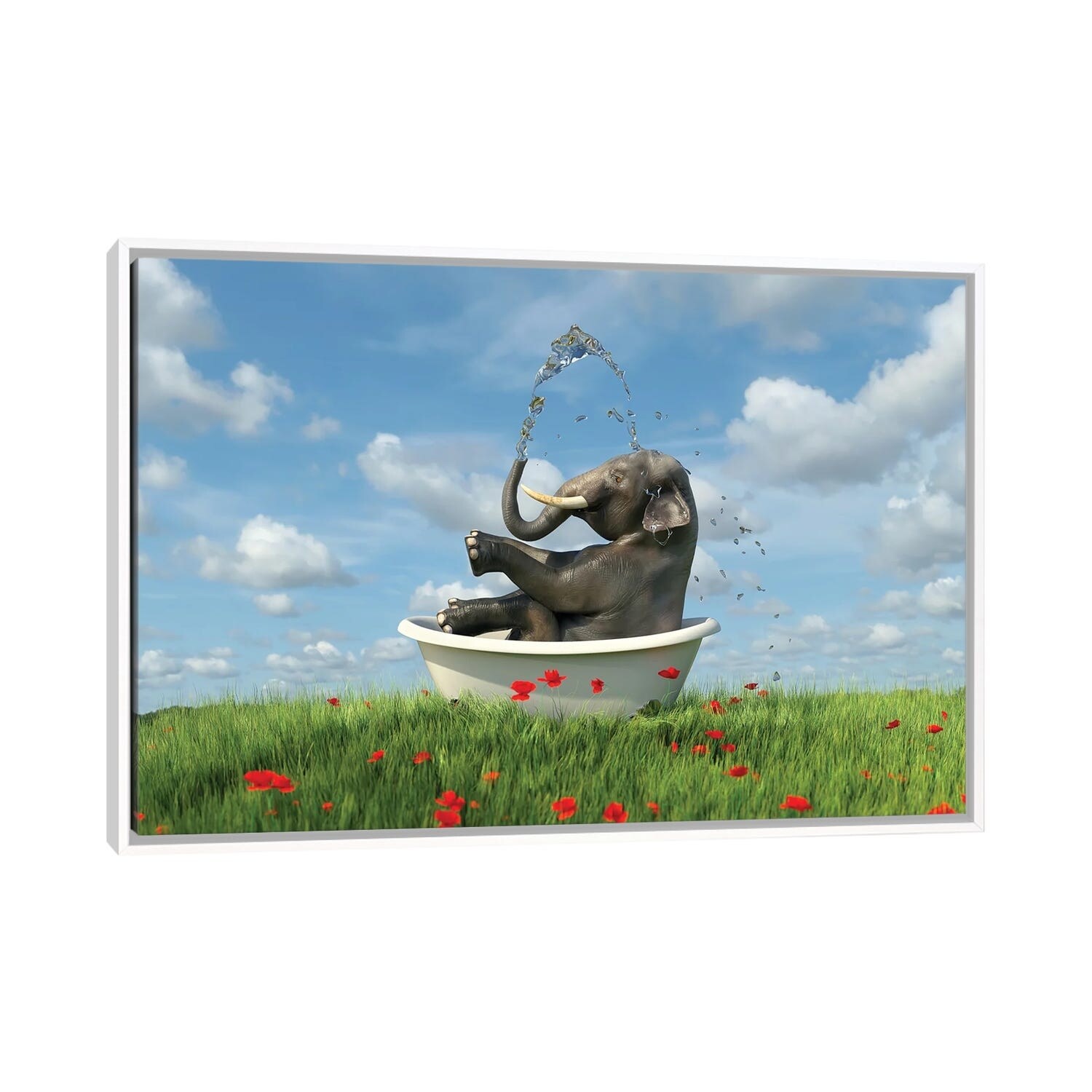 iCanvas "Elephant Relaxing in A Bath in the Meadow" by Mike Kiev Framed Canvas Print