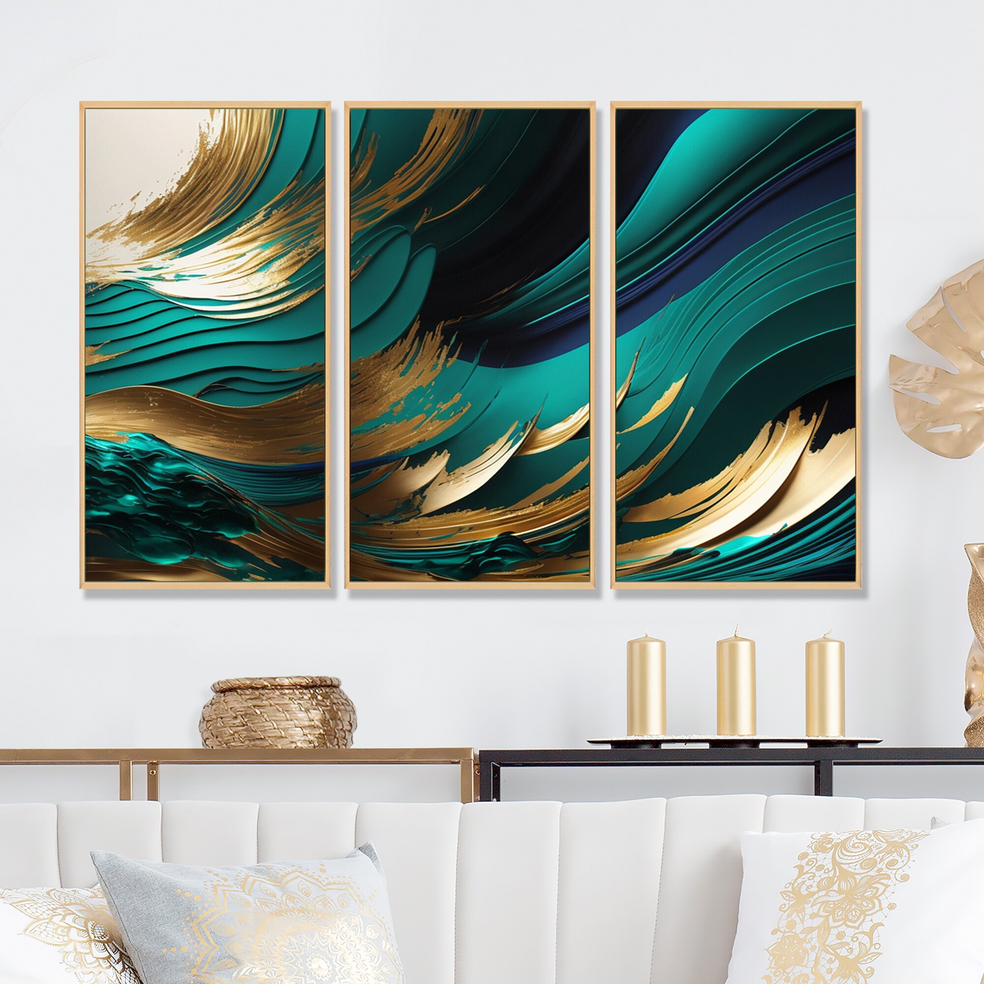 Designart "Green And Gold Agate IV" Transitional Framed Canvas Art Print - 3 Panels