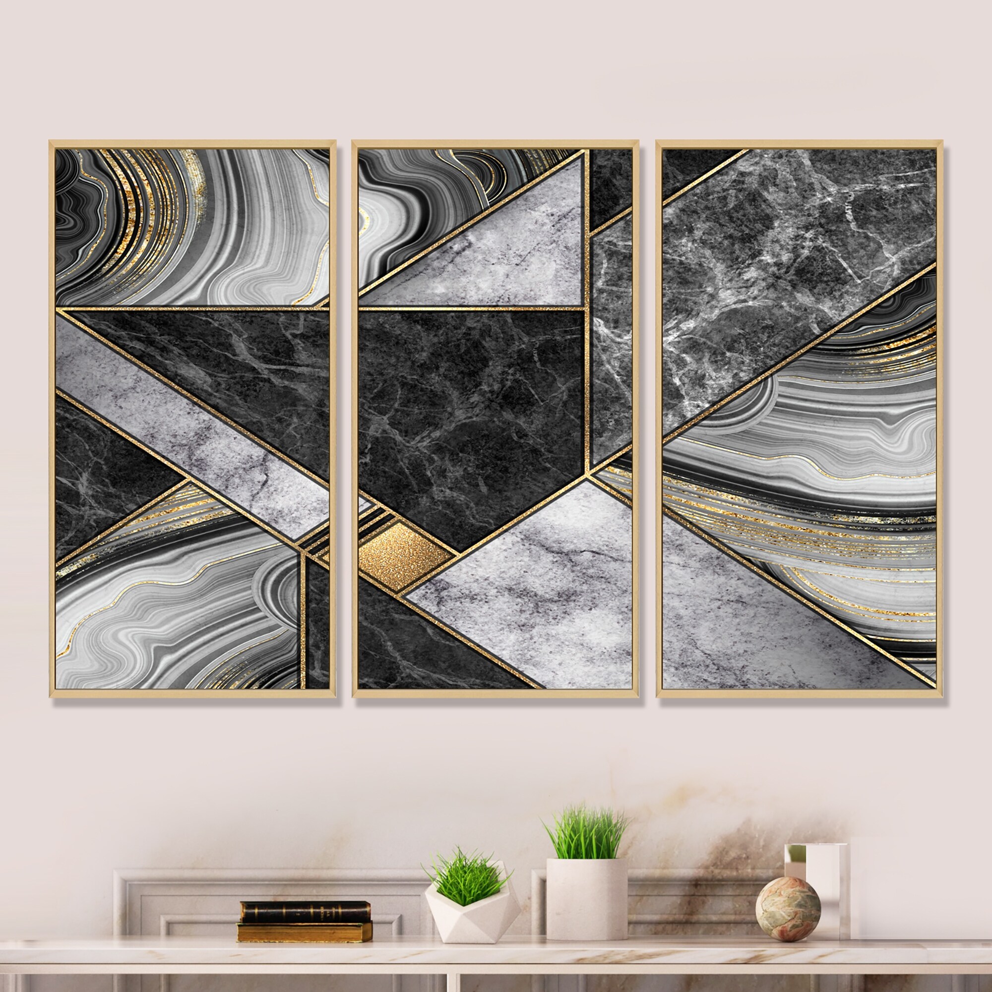 Designart "Marble Granite Agate With Touches of Gold" Modern Framed Artwork Set of 3 - 4 Colors of Frames