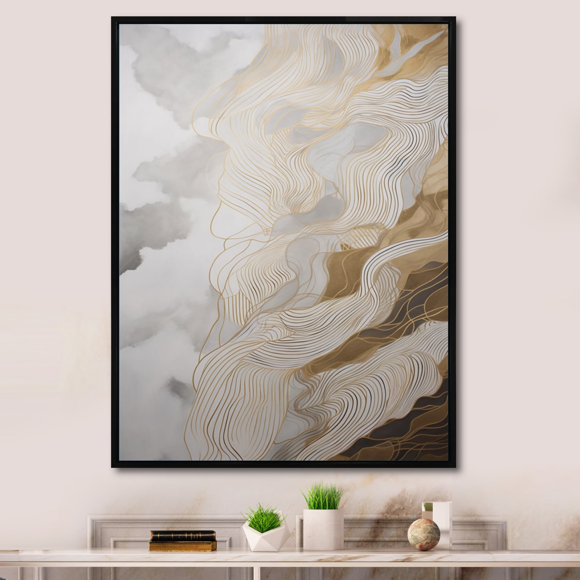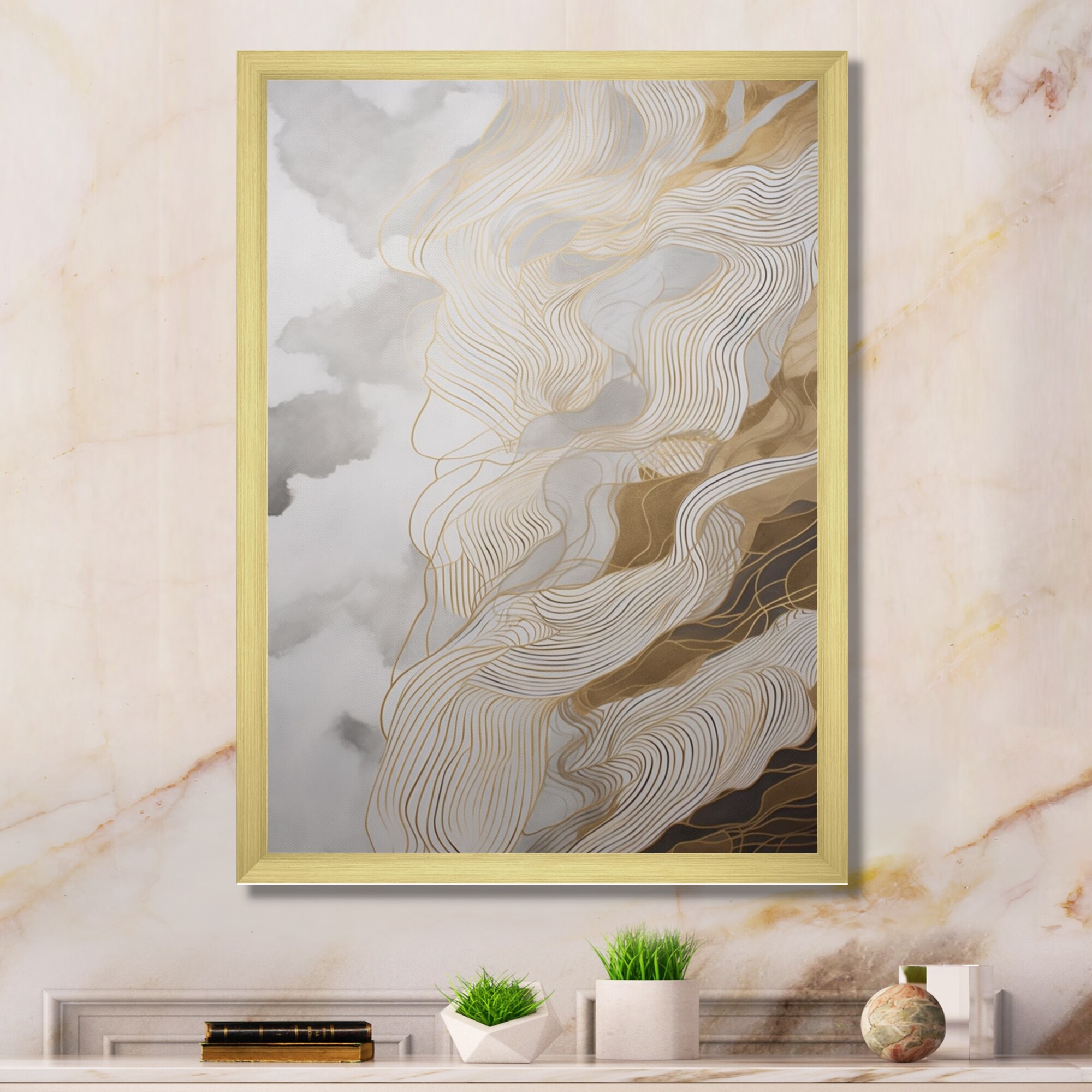 Designart "Gold And Grey Abstracted Line Artistry Iv" Minimalism Line Art Framed Canvas Print