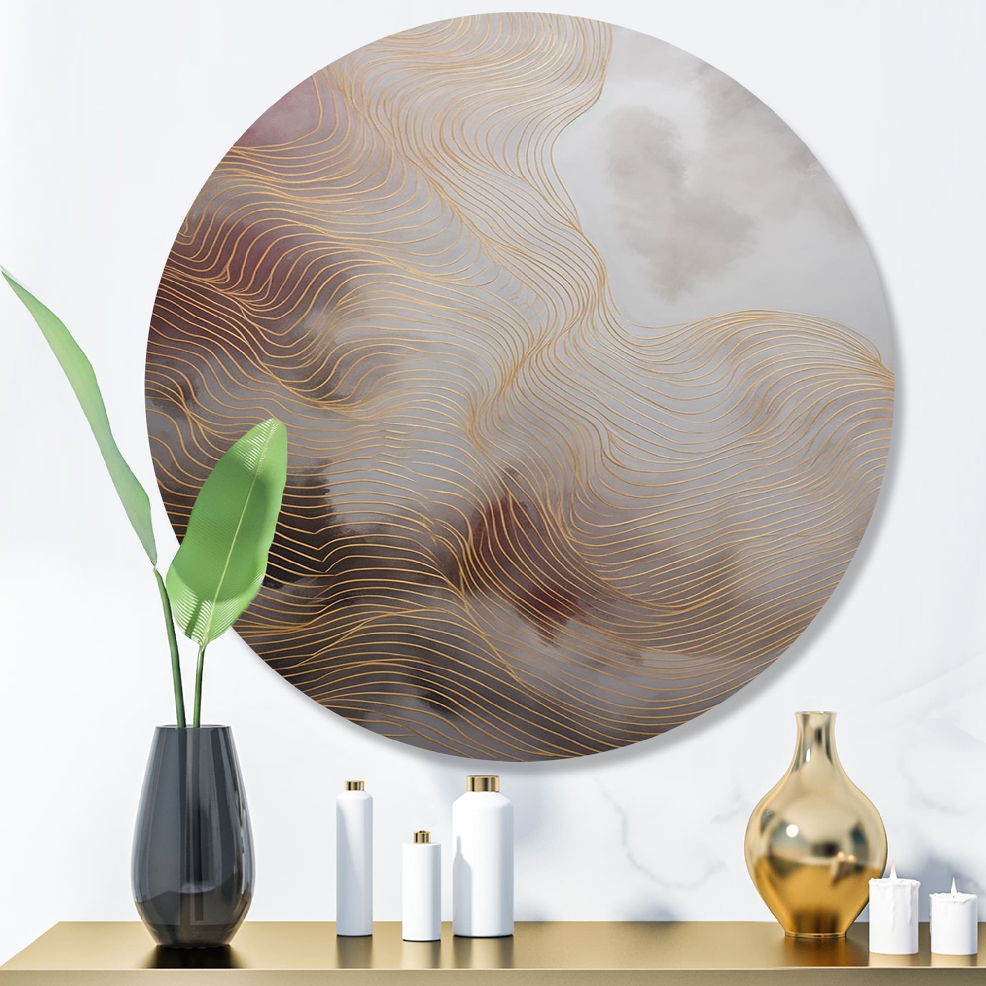 Designart "Gold And Grey Abstracted Line Artistry I" Minimalism Line Art Metal Round Wall Art