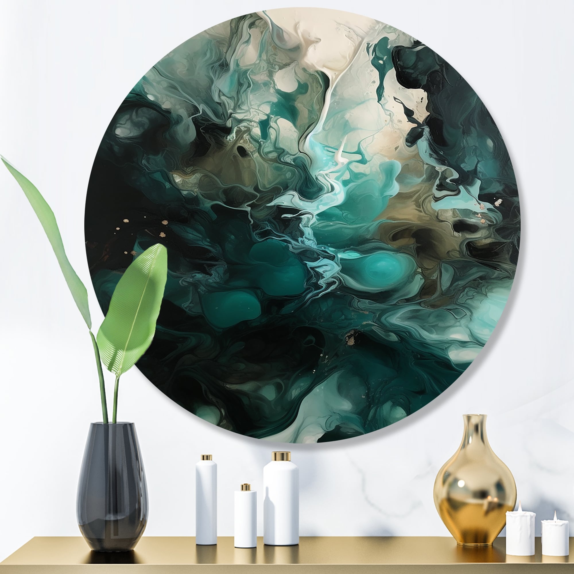 Designart "Green White Marbled Artistry III" Modern Geometric Metal Round Wall Art