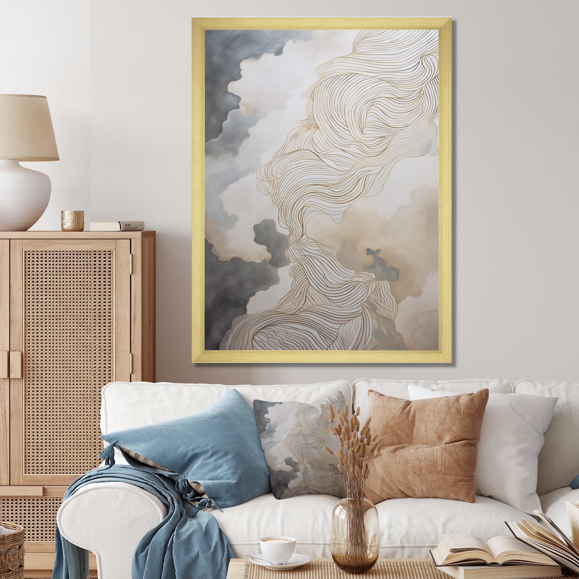 Designart "Gold And Grey Abstracted Line Artistry Iii" Minimalism Line Art Framed Canvas Art Print