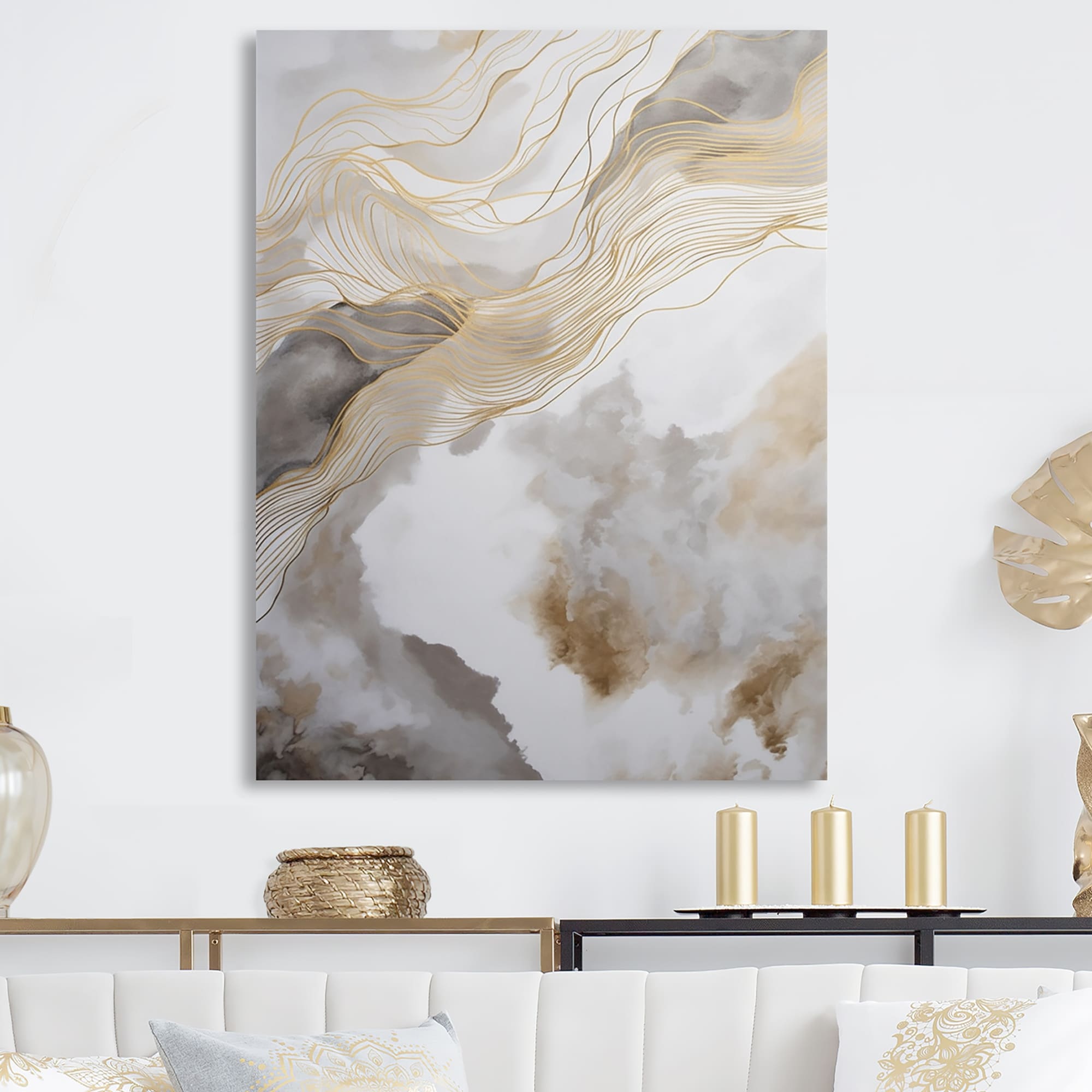 Designart "Gold And Grey Abstracted Line Artistry V" Minimalism Line Art Metal Wall Art