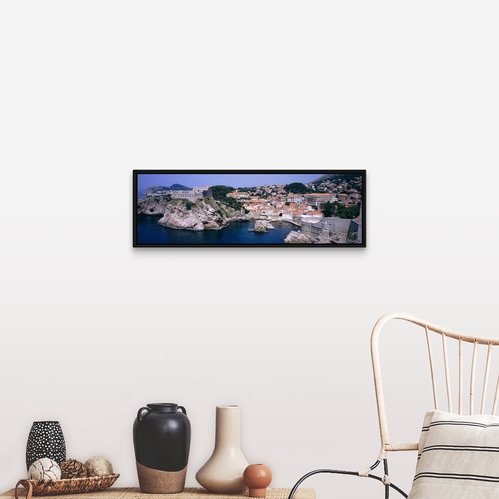 "Town at the waterfront, Lovrijenac Fortress, Bokar Fortress, Dubrovnik, Croatia" Black Float Frame Canvas Art
