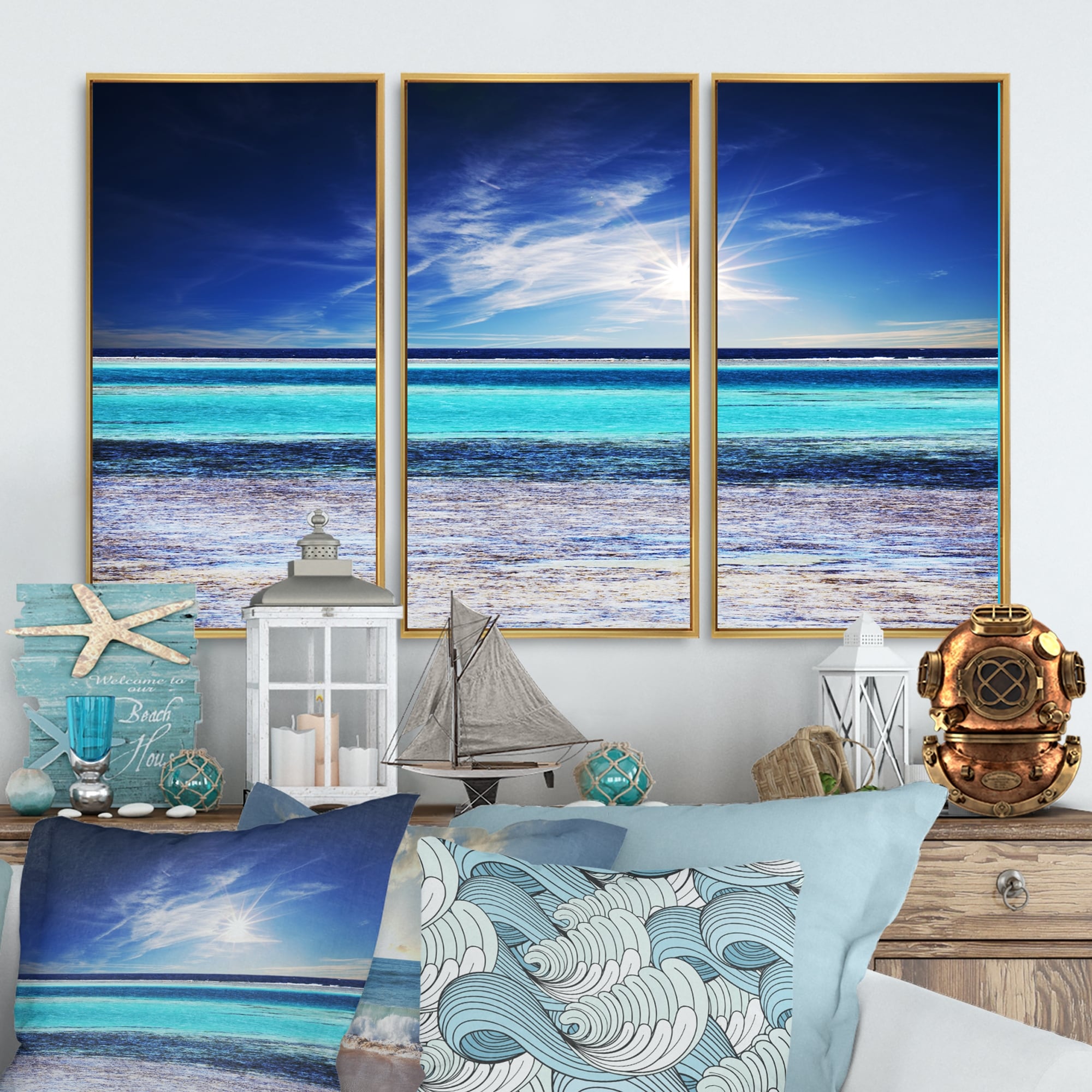 Designart "Crystal Clear Sea under Sunlight" Sea & Shore Framed Art Set of 3 - 4 Colors of Frames