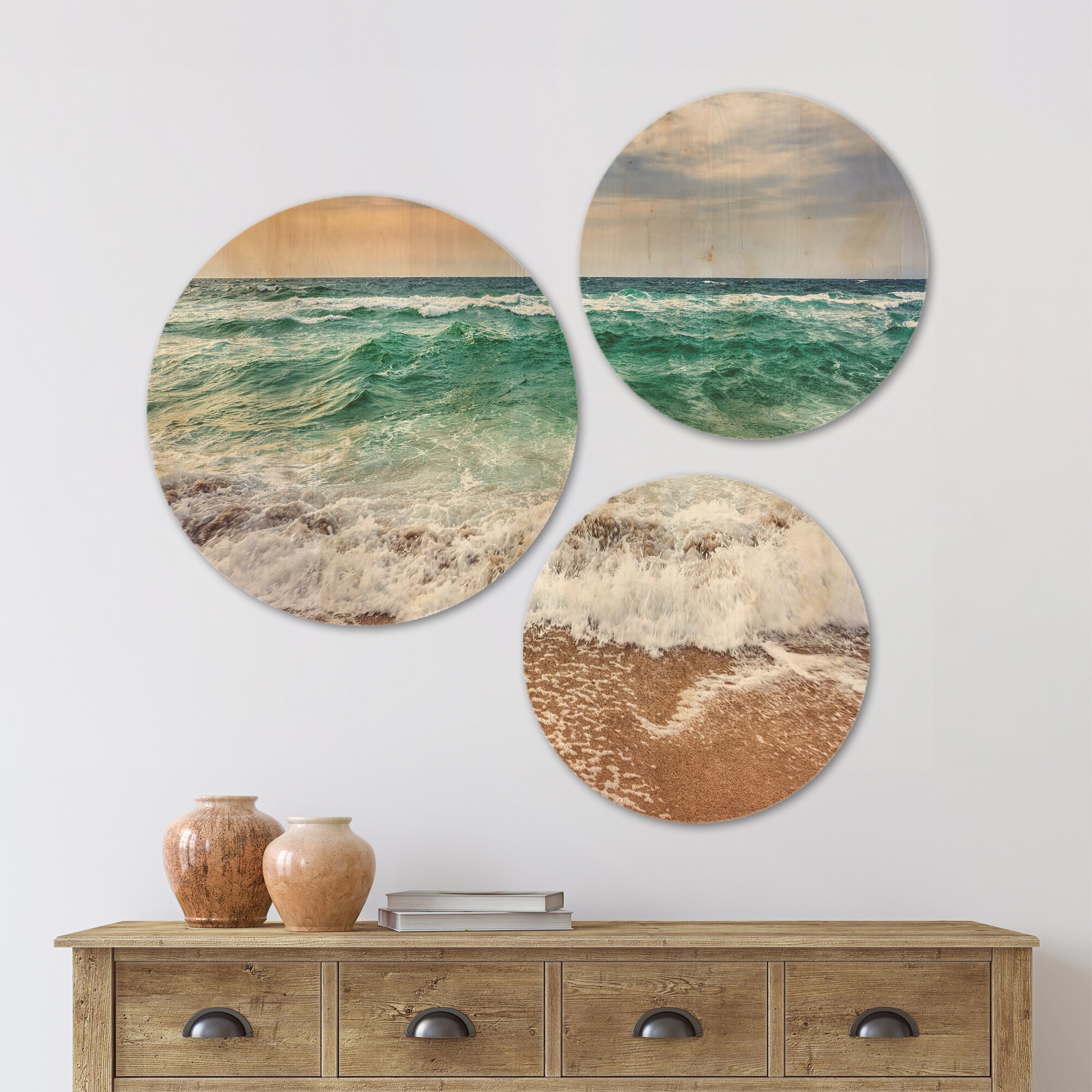 Designart 'Crystal Clear Blue Foaming Waves' Seascape Wood Wall Art Set of 3 Circles