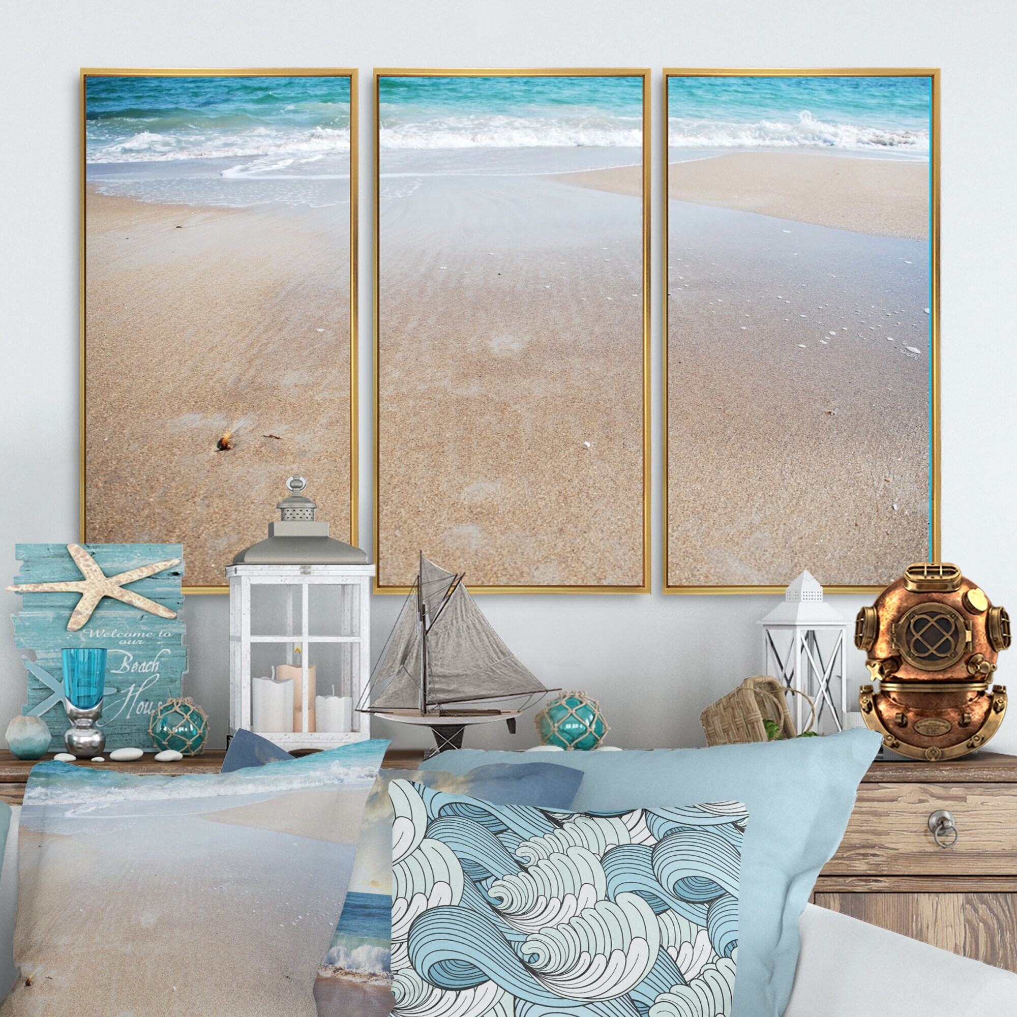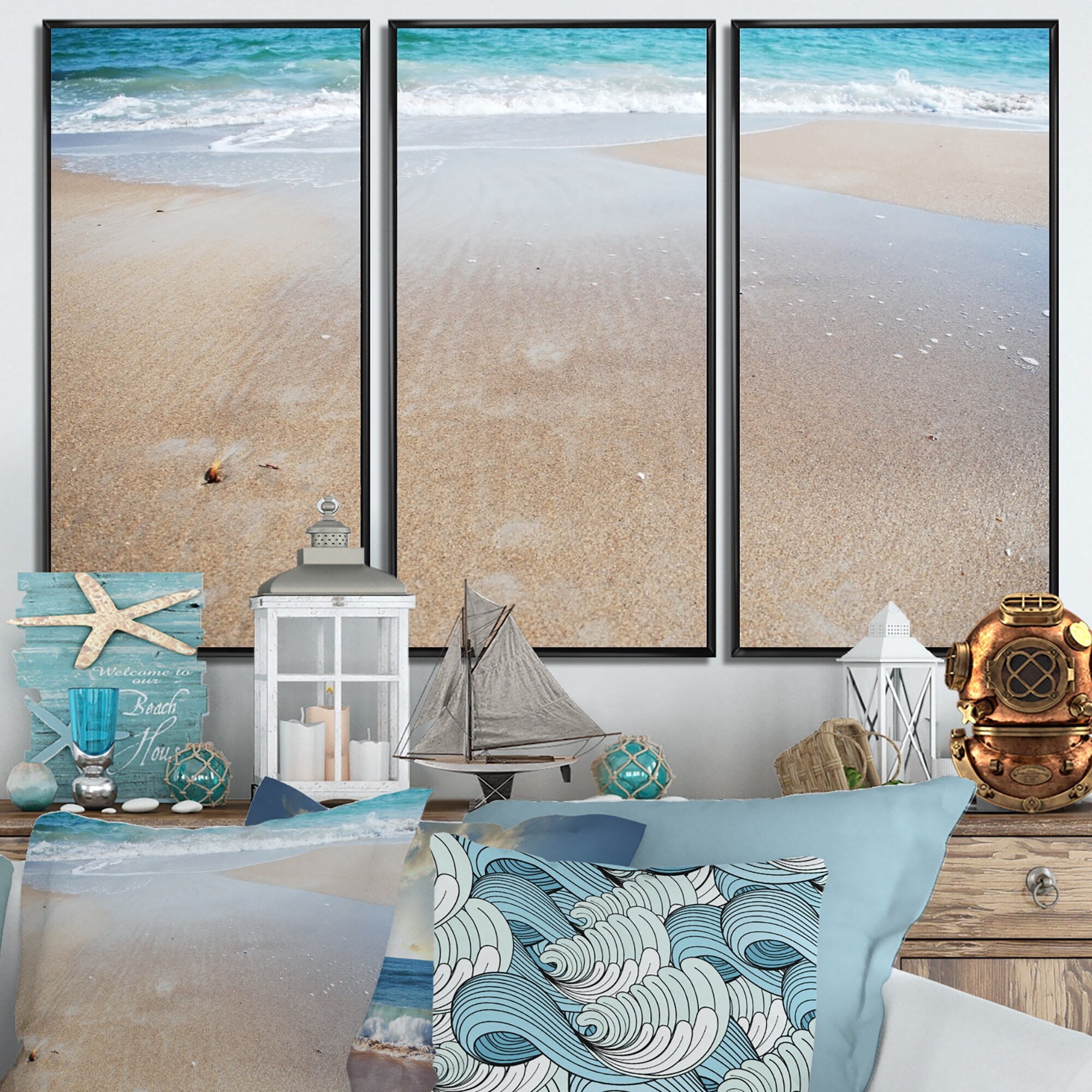 Designart "Crystal Clear Sea Waves on Beach" Sea & Shore Framed Wall Art Set of 3 - 4 Colors of Frames