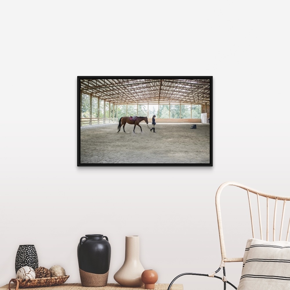 "Female equestrian walking horse in training arena" Black Float Frame Canvas Art