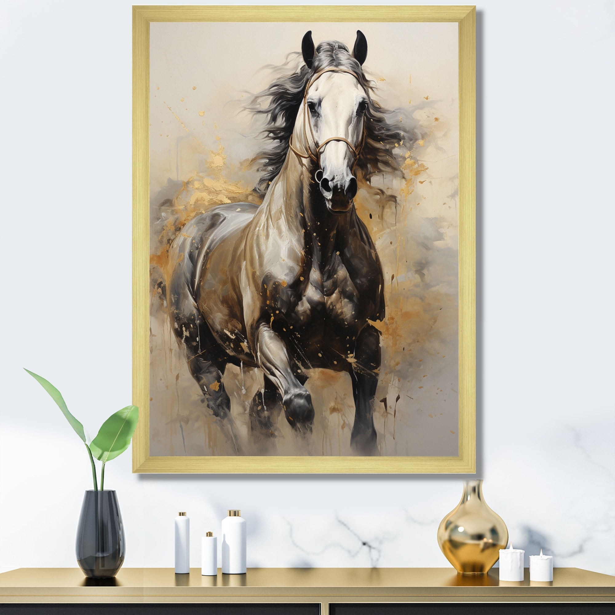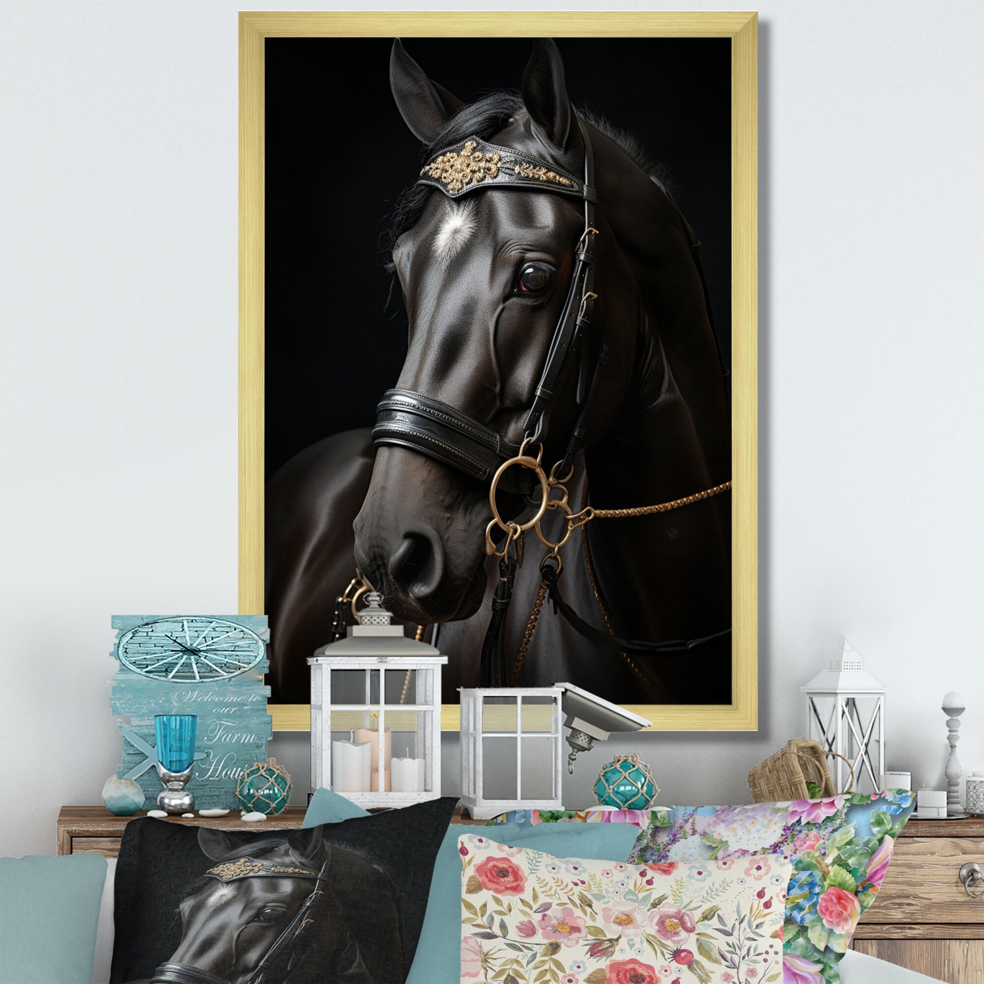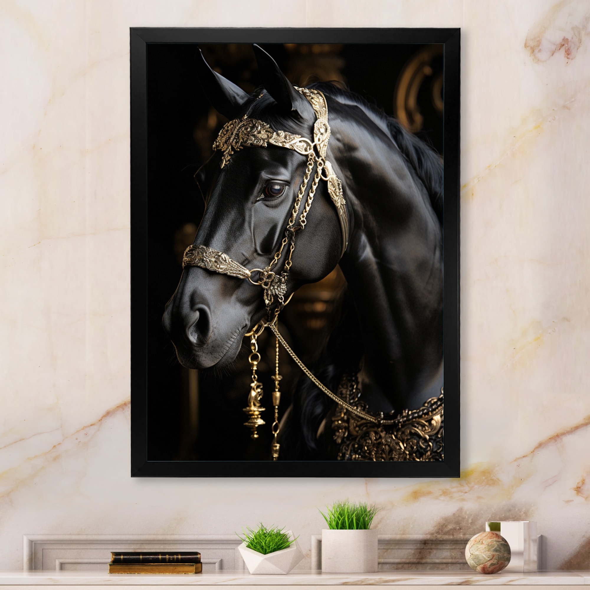 Designart "Black Gold Horse Golden Equestrian II" Animals Horse Framed Wall Art Prints