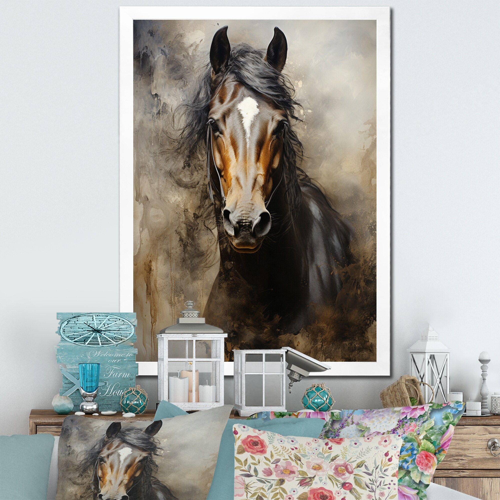 Designart "Black Gold Horse Golden Equestrian I" Animals Horse Framed Wall Art Living Room