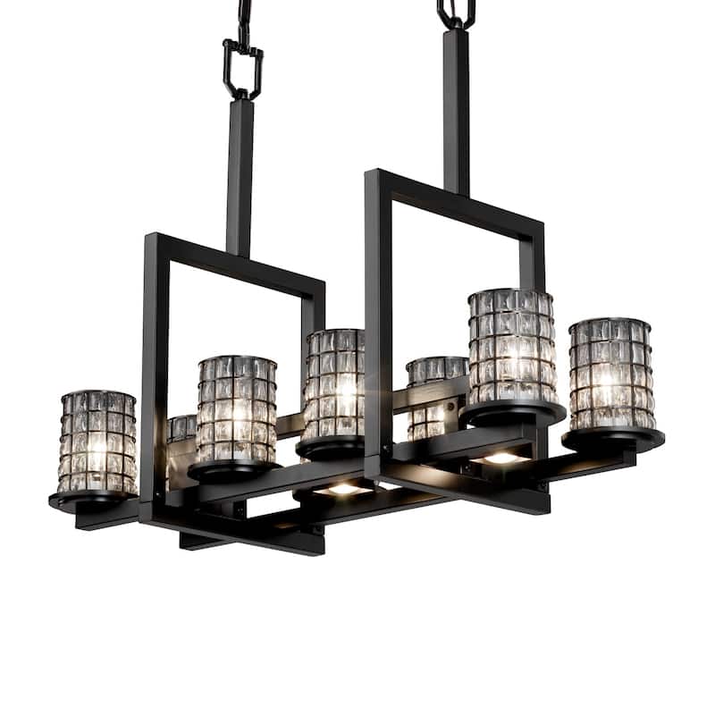Justice Design Wire Glass Dakota Matte Black 8-up and 3-downlight Chandelier, Clear Bubbles Cylinder Flat Rim Shade - Grid Cage