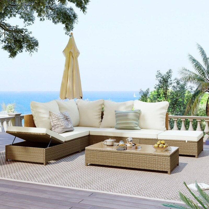 6-Piece Patio Furniture Set Outdoor Sectional Sofa sets w/ Glass Table, Ottomans