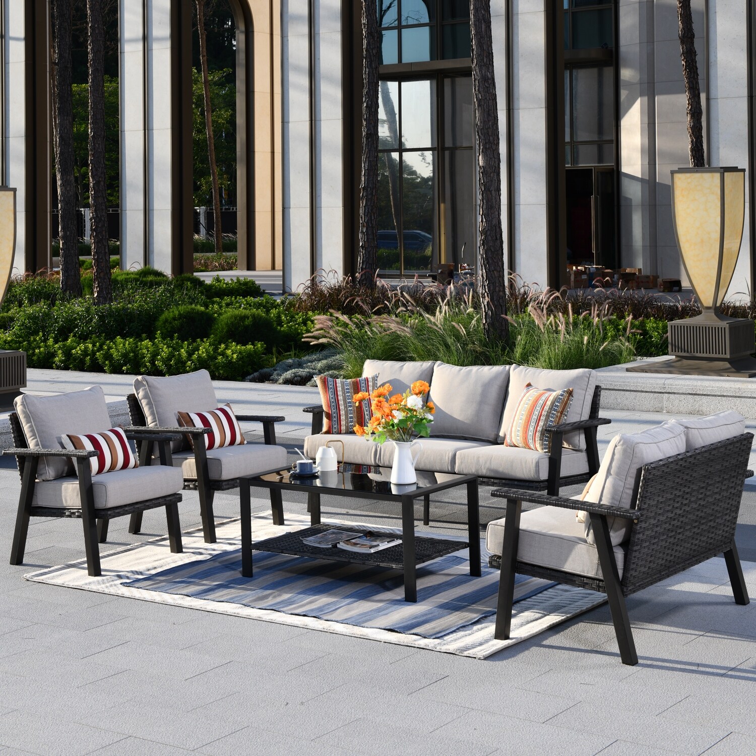 OVIOS 5-piece Outdoor Steel Frame Ottoman Wicker Solid Pattern Cushion Sectional Set Glass Top Table