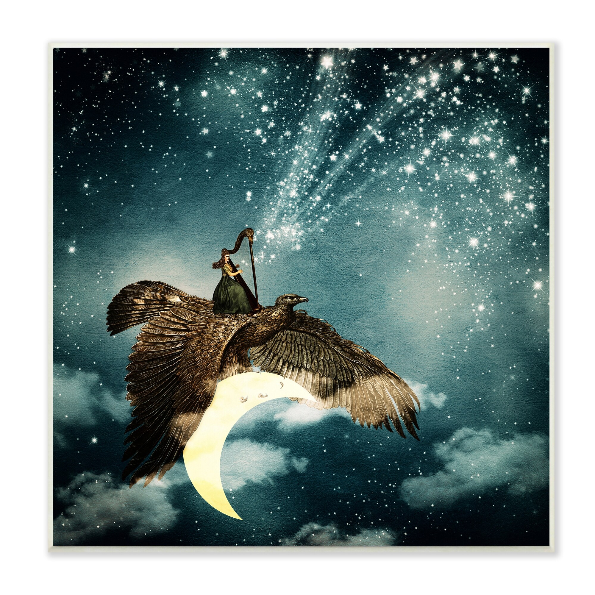 Stupell Dreamy Surreal Bird Flying Moon Harp Galaxy Stars Wood Wall Art - Blue