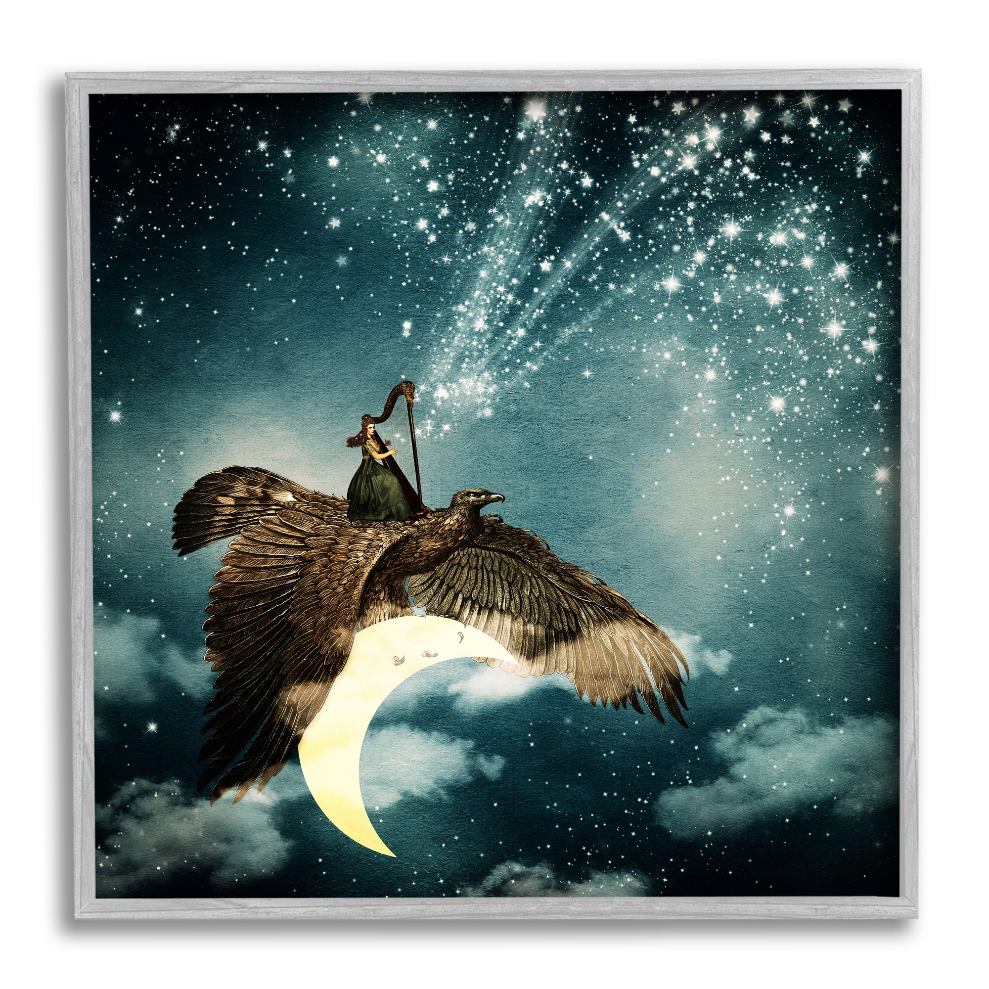 Stupell Dreamy Surreal Bird Flying Moon Harp Galaxy Stars Framed Wall Art - Blue