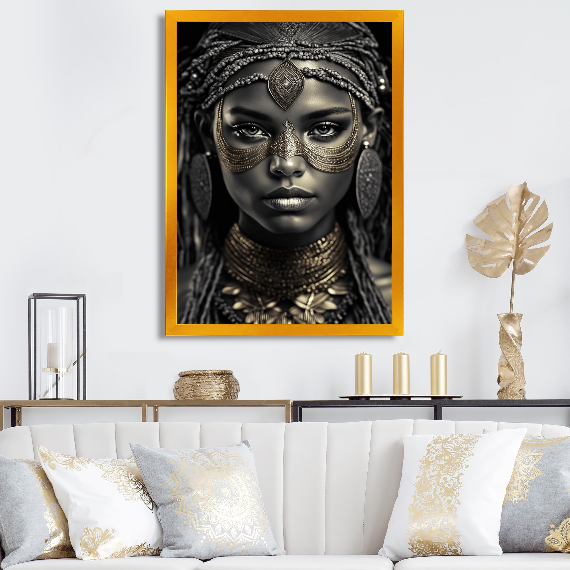 Designart "Bohemian Woman Traditional Headdress Vintage Gold II" Boho Woman Framed Canvas Wall Art Print