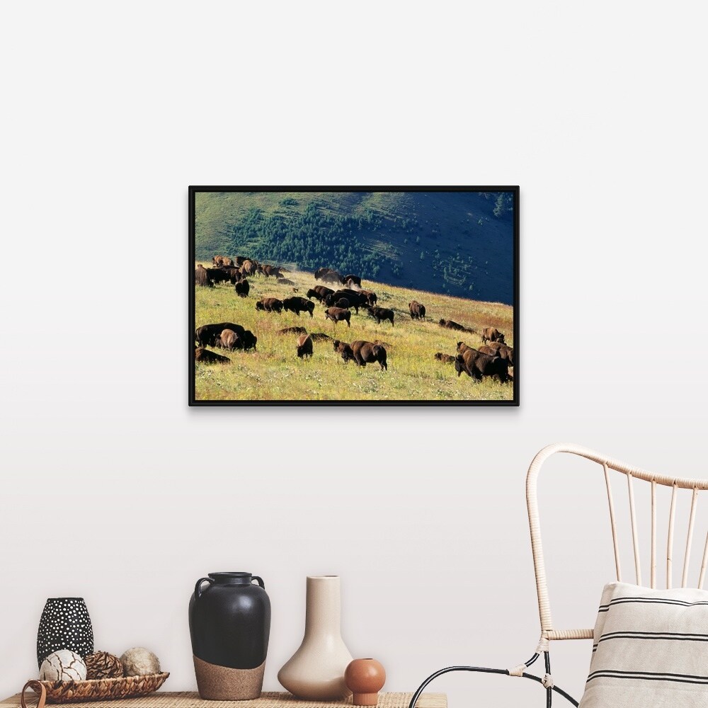 "Herd of Bison (Bison Bison) in Mountain Meadow" Black Float Frame Canvas Art