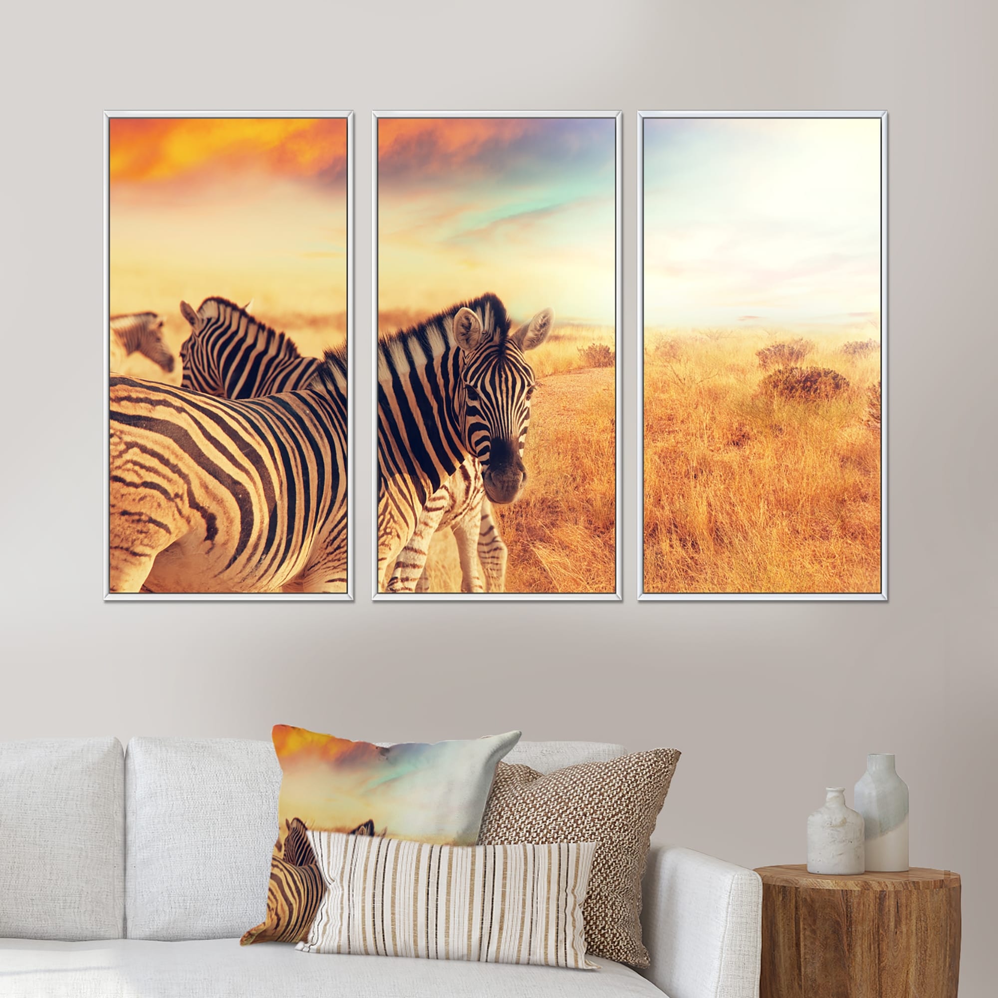 Designart "Zebras Herd in Field At Sunset" Animal Framed Wall Art Set of 3 - 4 Colors of Frames