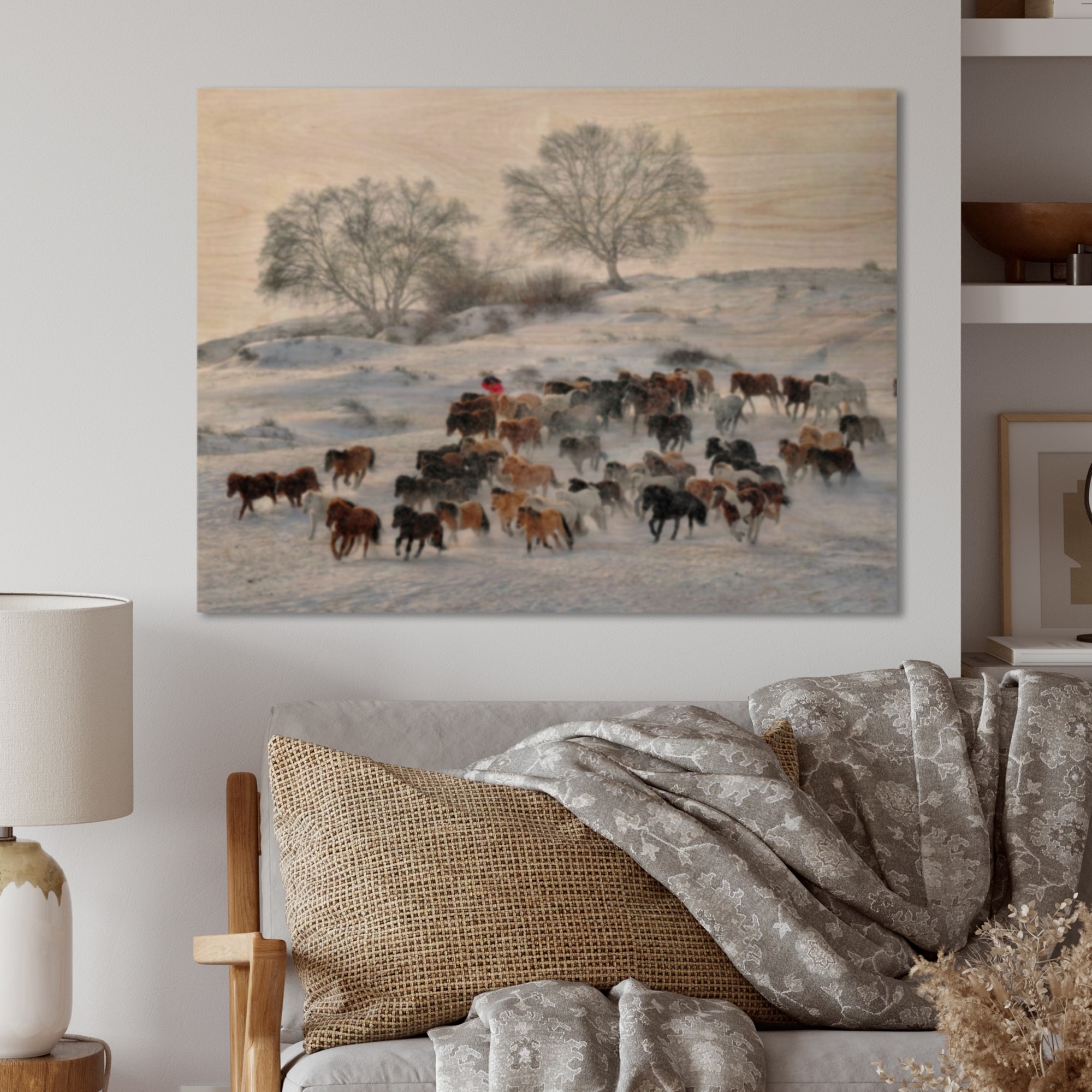 Designart 'Herd Of Horses in the Snow' Farmhouse Wood Wall Art Décor - Natural Pine Wood