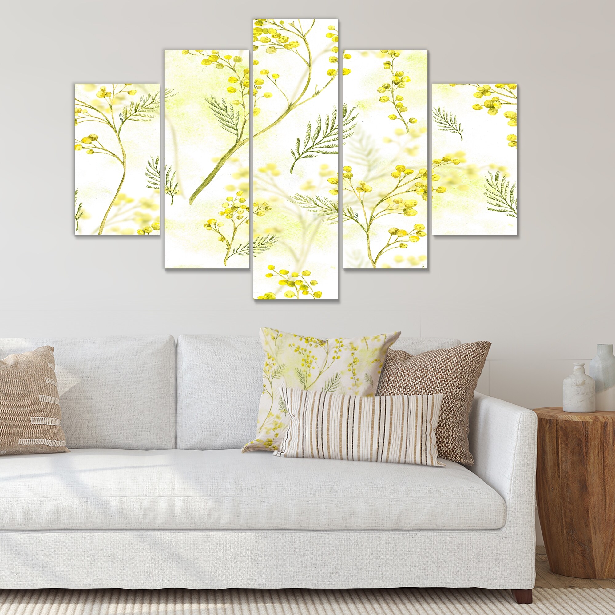 Designart "Yellow Sprigs of Mimosa Flowers" Patterned Canvas Wall Art Print - 60x32 - 5 Panels