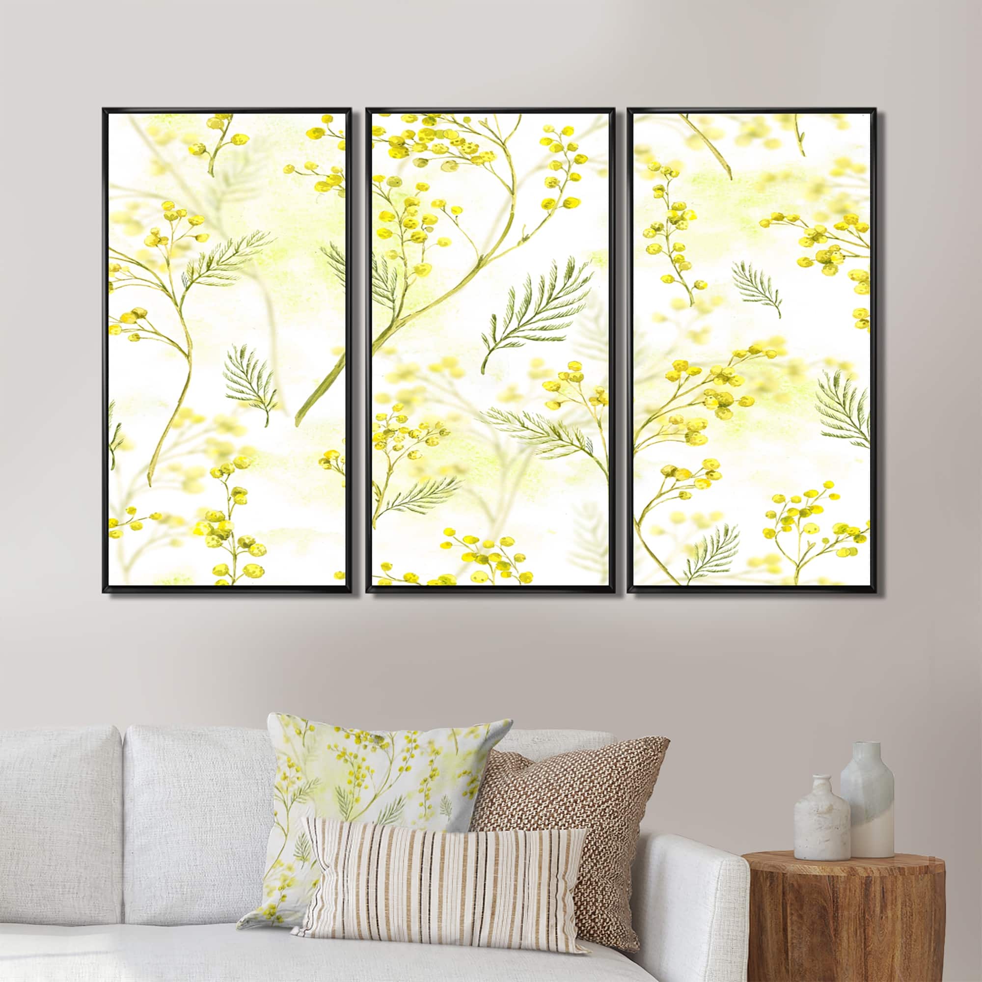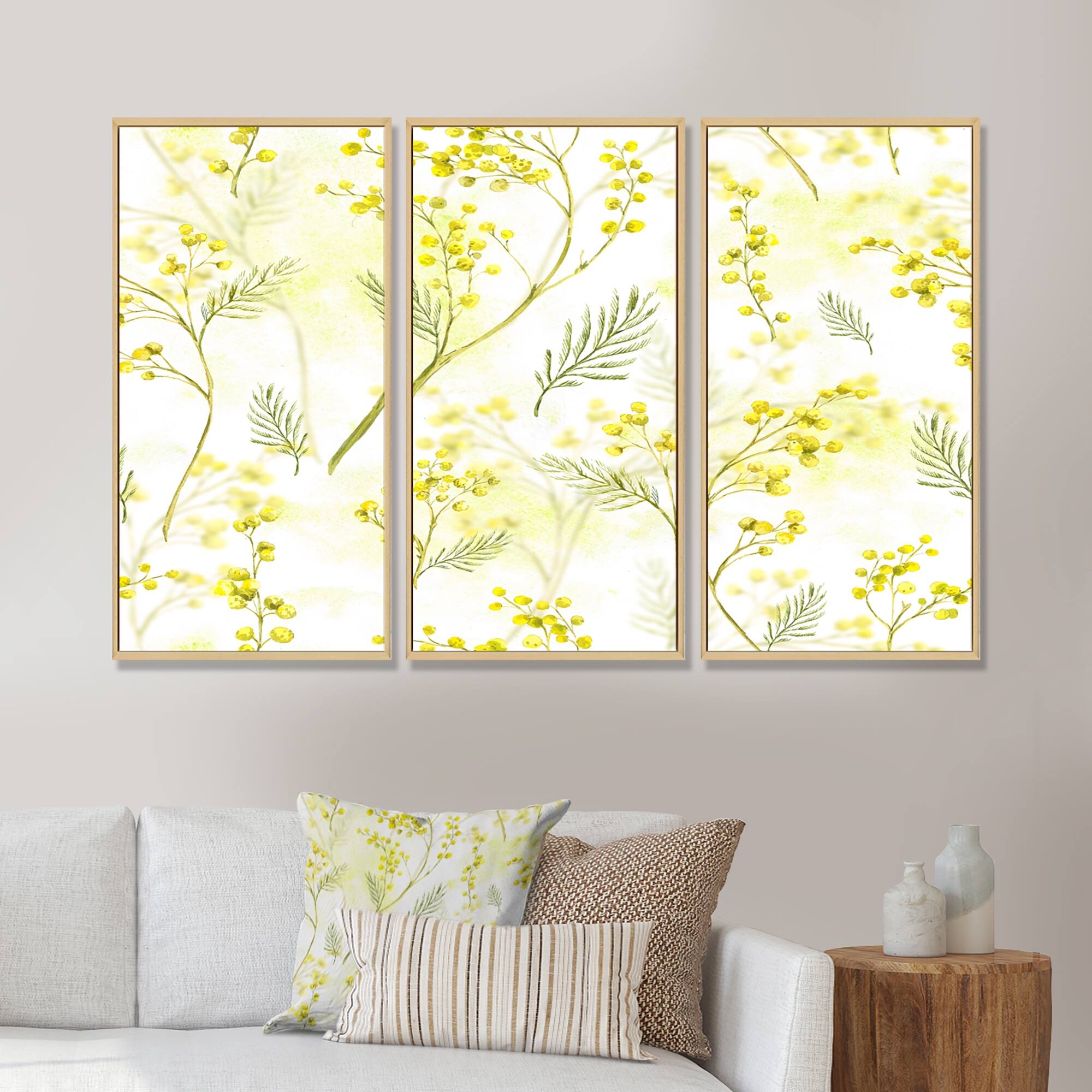 Designart "Yellow Sprigs of Mimosa Flowers" Patterned Framed Wall Art Set of 3 - 4 Colors of Frames