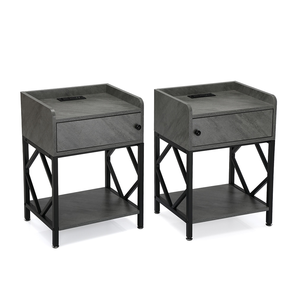 2pcs Modern Stony Grey Nightstand with Bottom Shelf and Socket