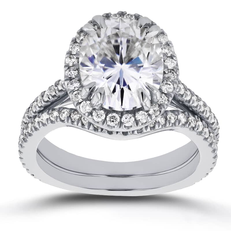 Annello by Kobelli 14k White Gold 3ct Oval Moissanite and 3/5ct TDW Diamond Halo 2-Piece Bridal Set