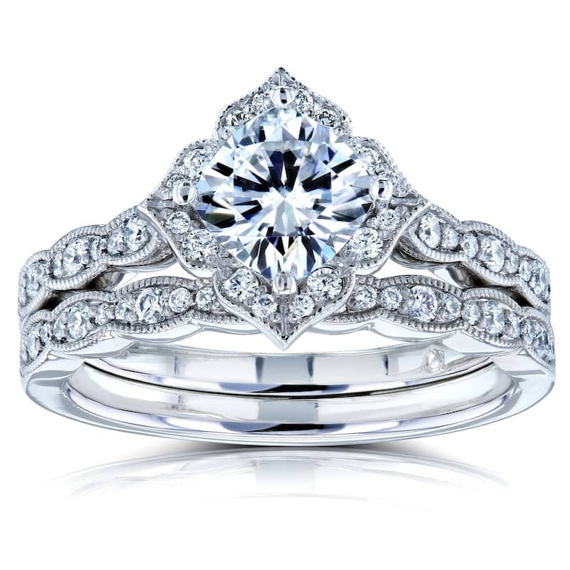 Kobelli 1.4 Carat Moissanite & Natural Diamond 14k Solid White Gold Cushion Floral Jasmine Bridal Set (DEF/VS, GH/I)