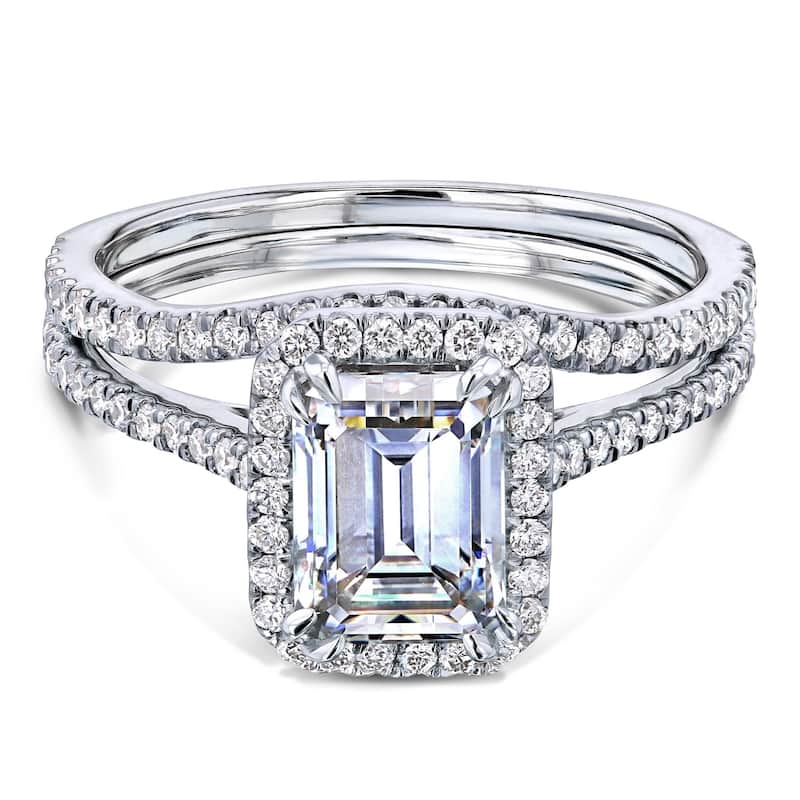 Annello by Kobelli 14k Gold 1.75ct Emerald Forever One Moissanite and 1/2ct TDW Lab Grown Diamond Halo Bridal Set (DEF/VS)