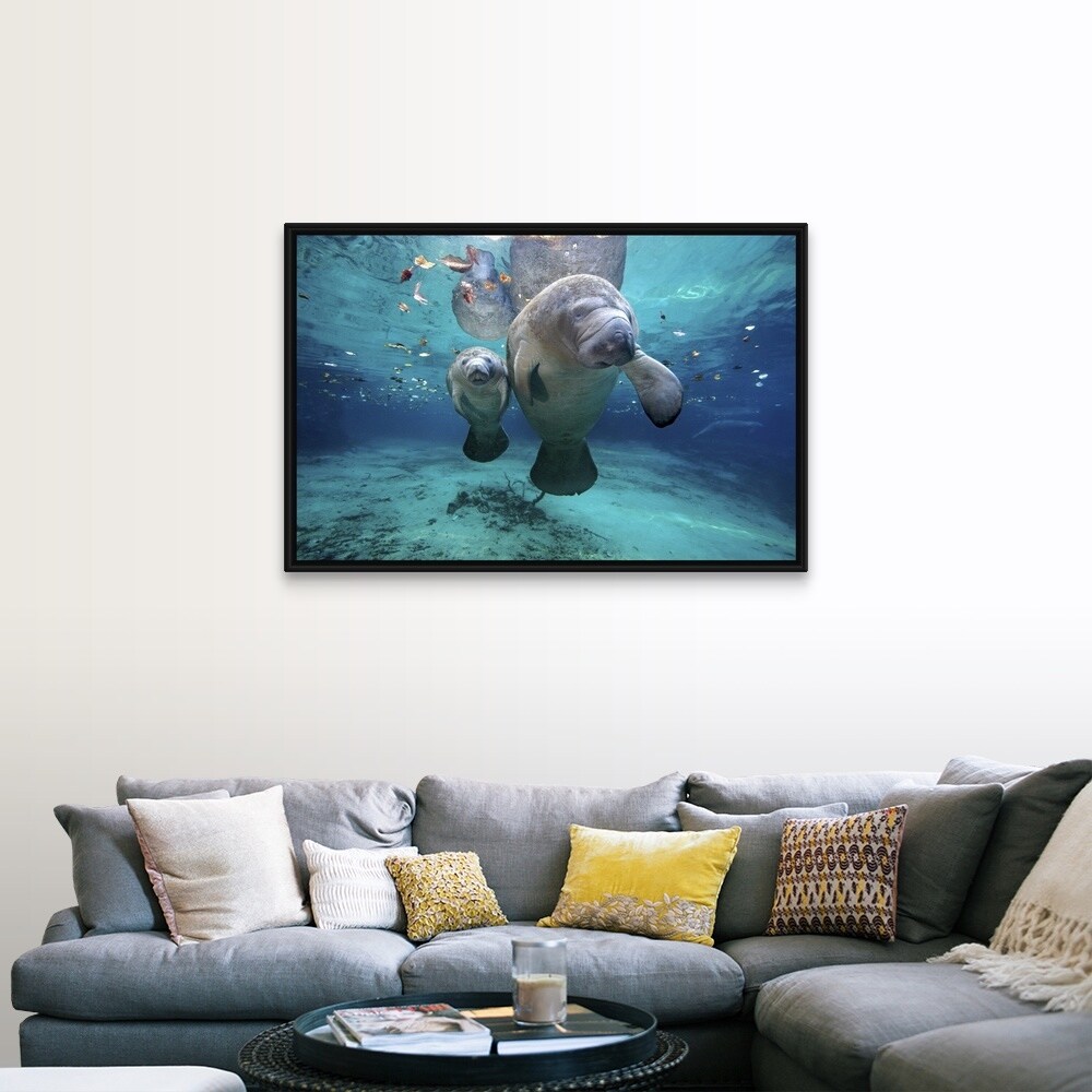 "Mom and baby manatee at Three Sisters Springs." Black Float Frame Canvas Art