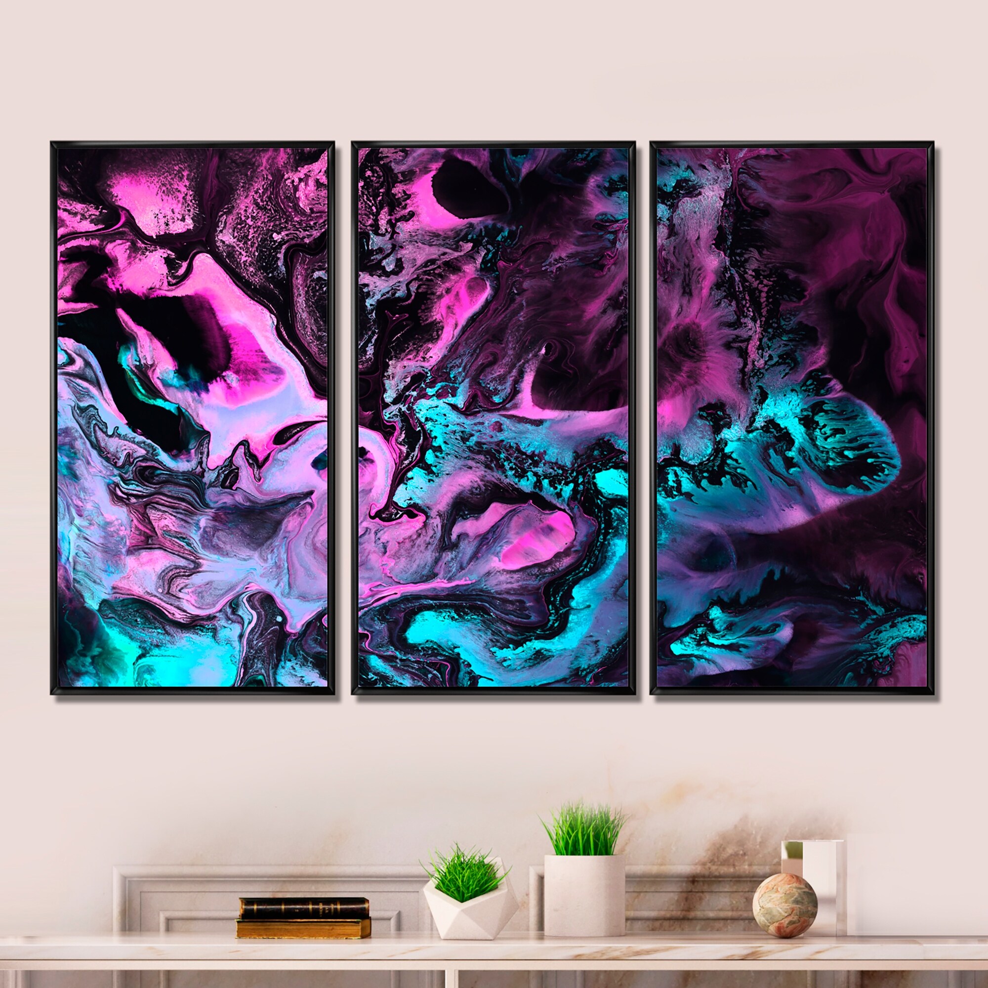 Designart "Neon Pink Blue And Green Liquid Art Landscape" Modern Framed Canvas Wall Art Print Set of 3 - 4 Colors of Frames