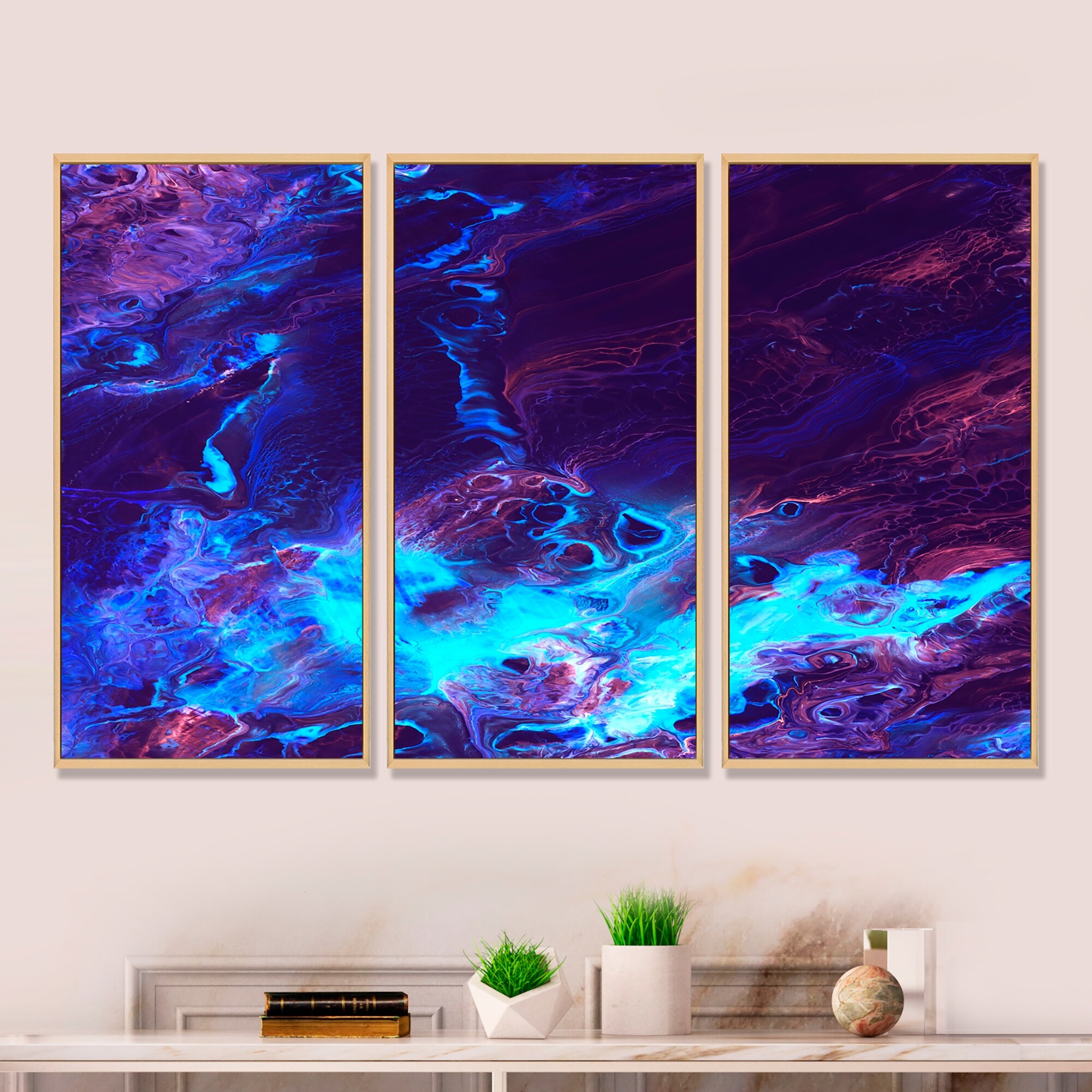 Designart "Neon Liquid Art in Purple And Blue" Modern Framed Wall Art Set of 3 - 4 Colors of Frames