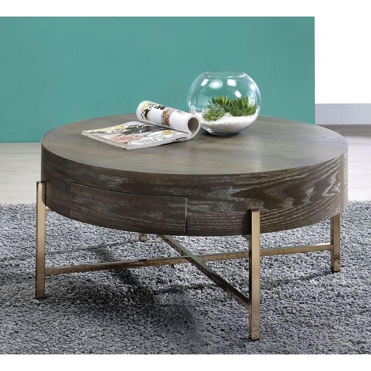 HomeRoots32" Champagne And Dark Oak Round Coffee Table With Drawer - 32