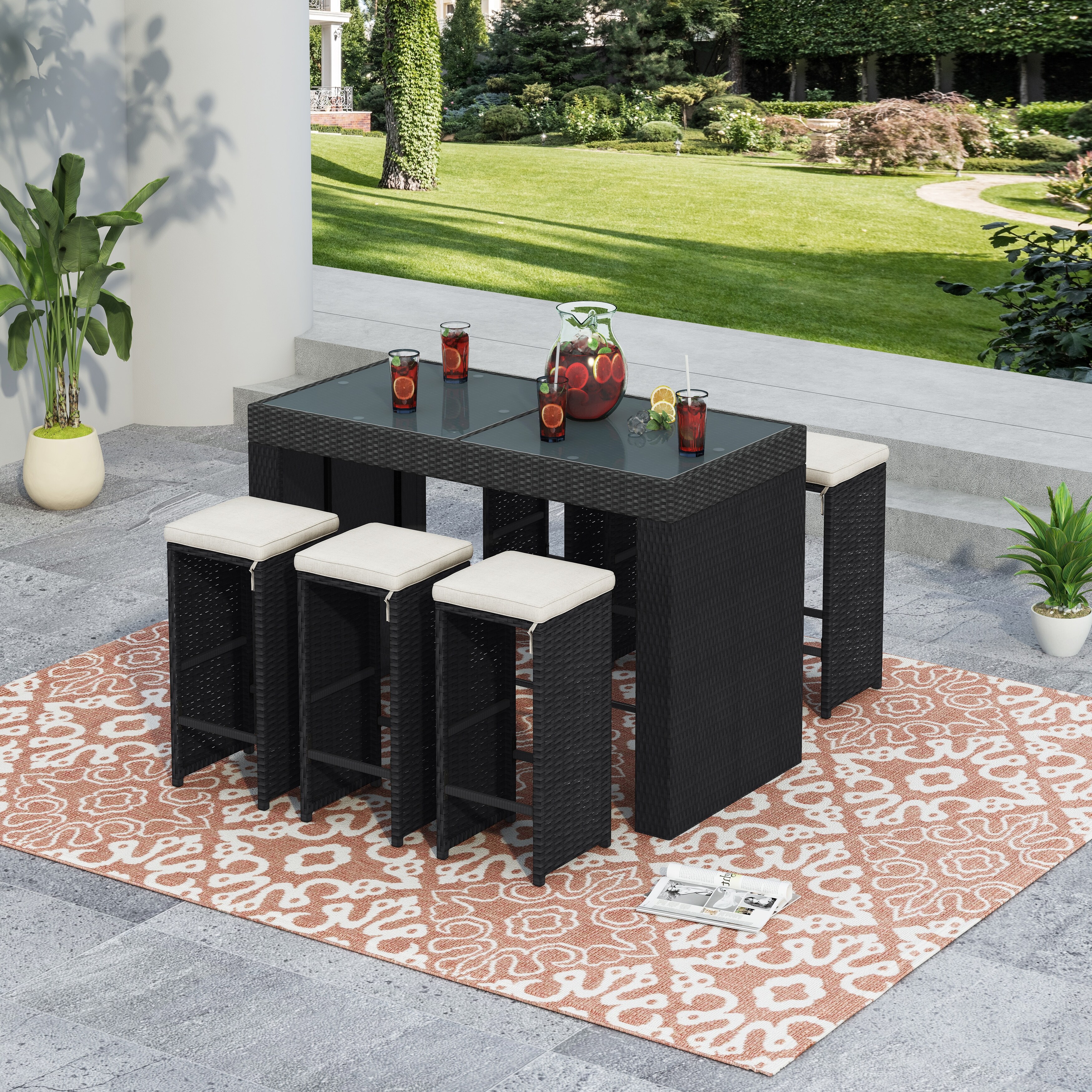 Gymax 7PCS Rattan Wicker Bar Set Patio Dining Furniture w/ Wood Table