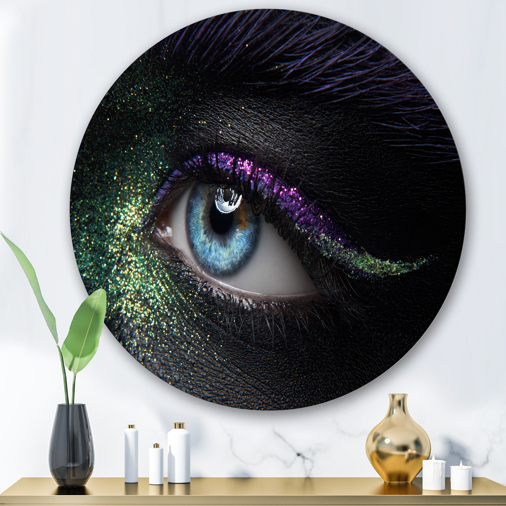 Designart 'Female Eyes With Green & Purple Pigment & Sparkles' Modern Metal Circle Wall Art